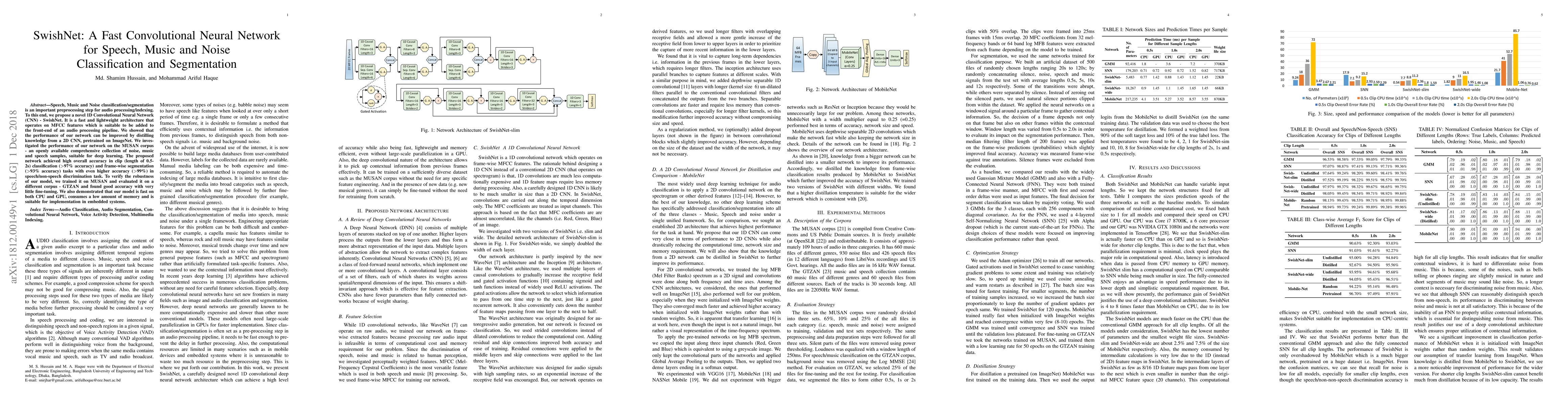 Speech, Music and Noise classification/segmentation is an important preprocessing step for audio processing/indexing. To this end, we propose a novel 1D Convolutional Neural Network (CNN) - SwishNet. It is a fast and lightweight architecture that operates on MFCC features which is suitable to be added to the front-end of an audio processing pipeline. We showed that the performance of our network can be improved by distilling knowledge from a 2D CNN, pretrained on ImageNet. We investigated the performance of our network on the MUSAN corpus - an openly available comprehensive collection of noise, music and speech samples, suitable for deep learning. The proposed network achieved high overall accuracy in clip (length of 0.5-2s) classification (>97% accuracy) and frame-wise segmentation (>93% accuracy) tasks with even higher accuracy (>99%) in speech/non-speech discrimination task. To verify the robustness of our model, we trained it on MUSAN and evaluated it on a different corpus - GTZAN and found good accuracy with very little fine-tuning. We also demonstrated that our model is fast on both CPU and GPU, consumes a low amount of memory and is suitable for implementation in embedded systems.