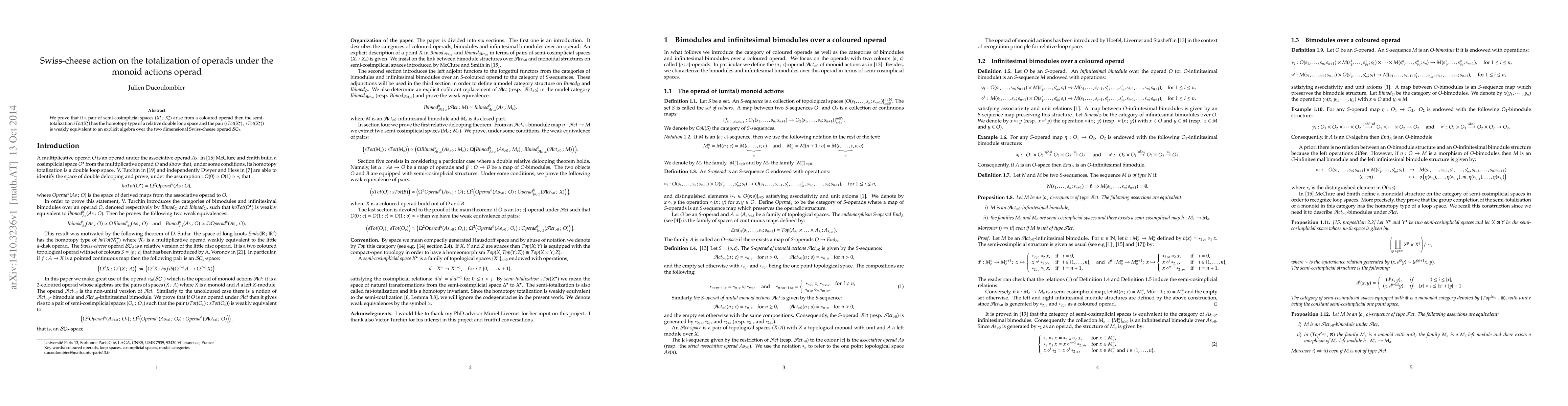 We prove that if a pair of semi-cosimplicial spaces (X,Y) arise from a coloured operad then the semi-totalization sTot(Y) has the homotopy type of a relative double loop space and the pair (sTot(X),sTot(Y)) is weakly equivalent to an explicit algebra over the two dimensional Swiss-cheese operad.