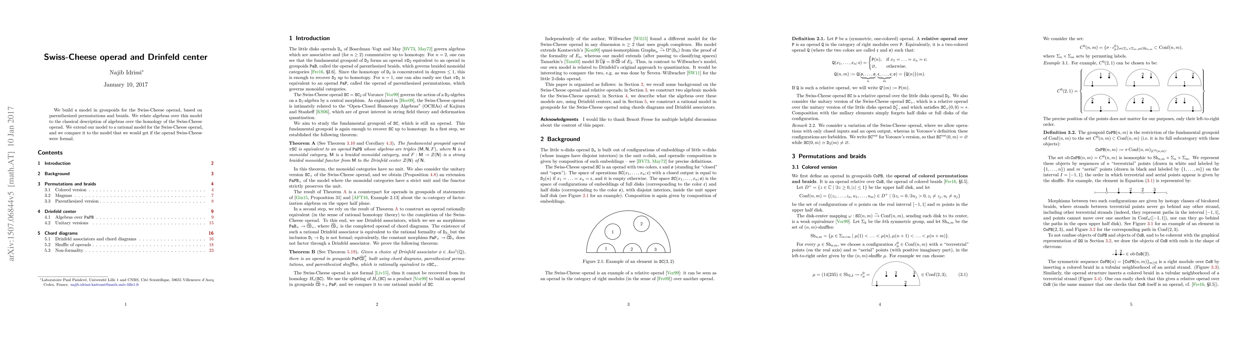 We build a model in groupoids for the Swiss-Cheese operad, based on parenthesized permutations and braids, and we relate algebras over this model to the classical description of algebras over the homology of the Swiss-Cheese operad. We extend our model to a rational model for the Swiss-Cheese operad, and we compare it to the model that we would get if the operad Swiss-Cheese were formal.