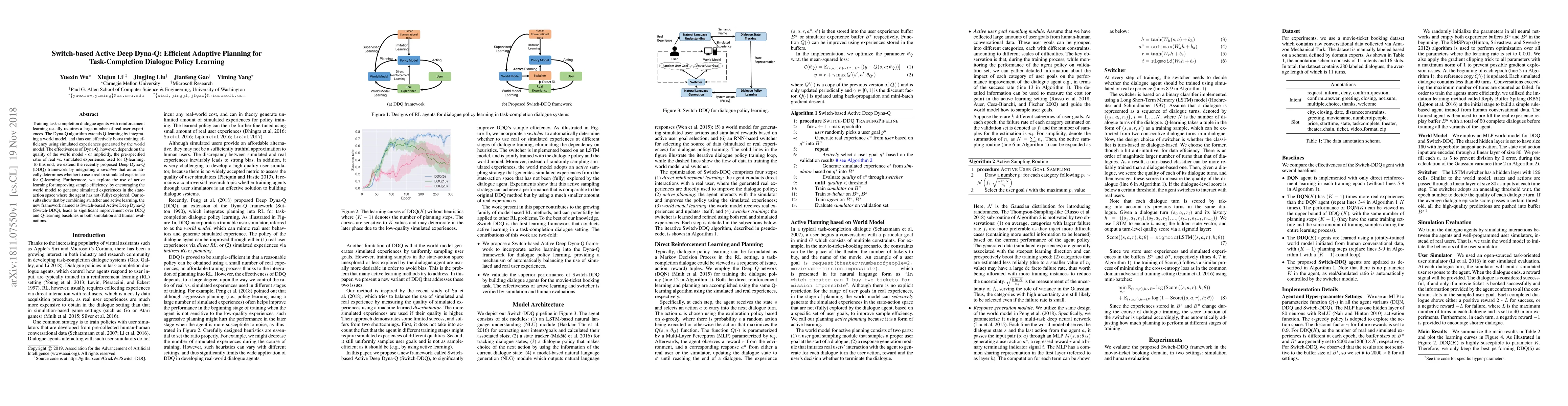 The Switch-based Active Deep Dyna-Q (Switch-DDQ) framework enhances task-completion dialogue agents by integrating a switcher to choose real or simulated experiences and active learning to focus on unexplored state-action spaces, achieving better efficiency and performance compared to Deep Dyna-Q and Q-learning baselines.