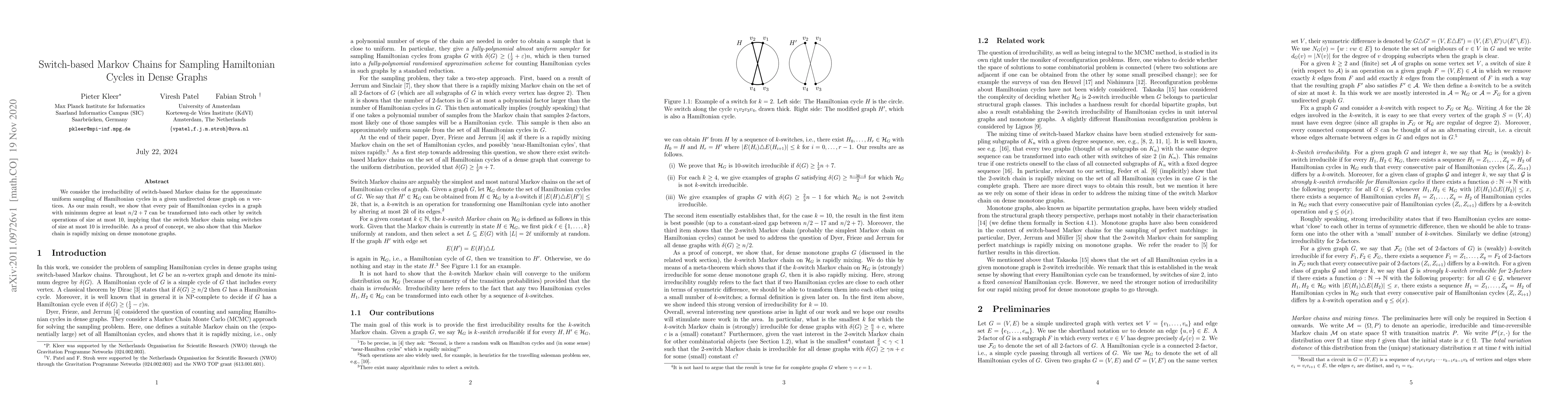 This paper investigates the irreducibility of switch-based Markov chains for sampling Hamiltonian cycles in dense graphs. It demonstrates that such chains are irreducible and rapidly mixing for graphs with minimum degree at least $n/2+7$, using switch operations of size at most $10$.