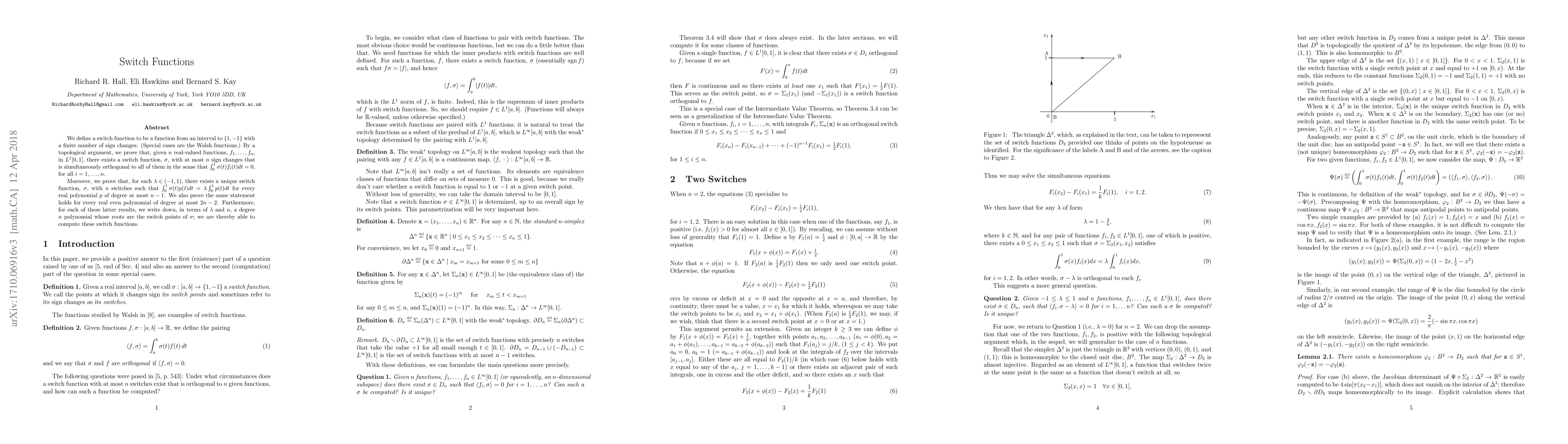We define a switch function to be a function from an interval to $\{1,-1\}$ with a finite number of sign changes. (Special cases are the Walsh functions.) By a topological argument, we prove that, given $n$ real-valued functions, $f_1, \dots, f_n$, in $L^1[0,1]$, there exists a switch function, $\sigma$, with at most $n$ sign changes that is simultaneously orthogonal to all of them in the sense that $\int_0^1 \sigma(t)f_i(t)dt=0$, for all $i = 1, \dots , n$. Moreover, we prove that, for each $\lambda \in (-1,1)$, there exists a unique switch function, $\sigma$, with $n$ switches such that $\int_0^1 \sigma(t) p(t) dt = \lambda \int_0^1 p(t)dt$ for every real polynomial $p$ of degree at most $n-1$. We also prove the same statement holds for every real even polynomial of degree at most $2n-2$. Furthermore, for each of these latter results, we write down, in terms of $\lambda$ and $n$, a degree $n$ polynomial whose roots are the switch points of $\sigma$; we are thereby able to compute these switch functions.