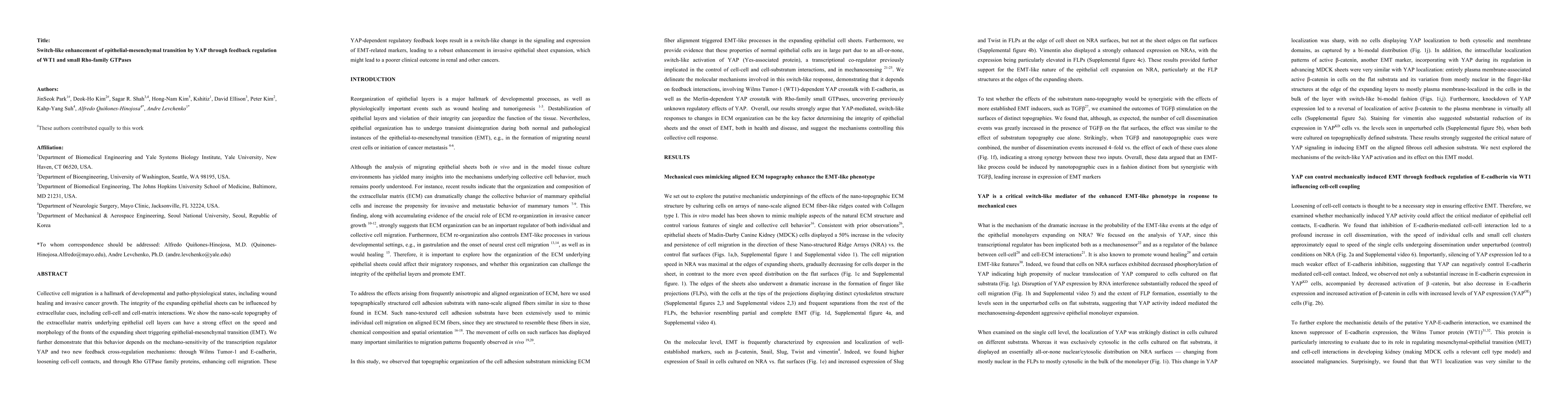 This paper demonstrates that the nano-scale topography of the extracellular matrix triggers epithelial-mesenchymal transition (EMT) through mechano-sensitive YAP, which enhances EMT via feedback loops involving WT1 and Rho GTPases, leading to invasive epithelial sheet expansion and potentially poorer cancer outcomes.