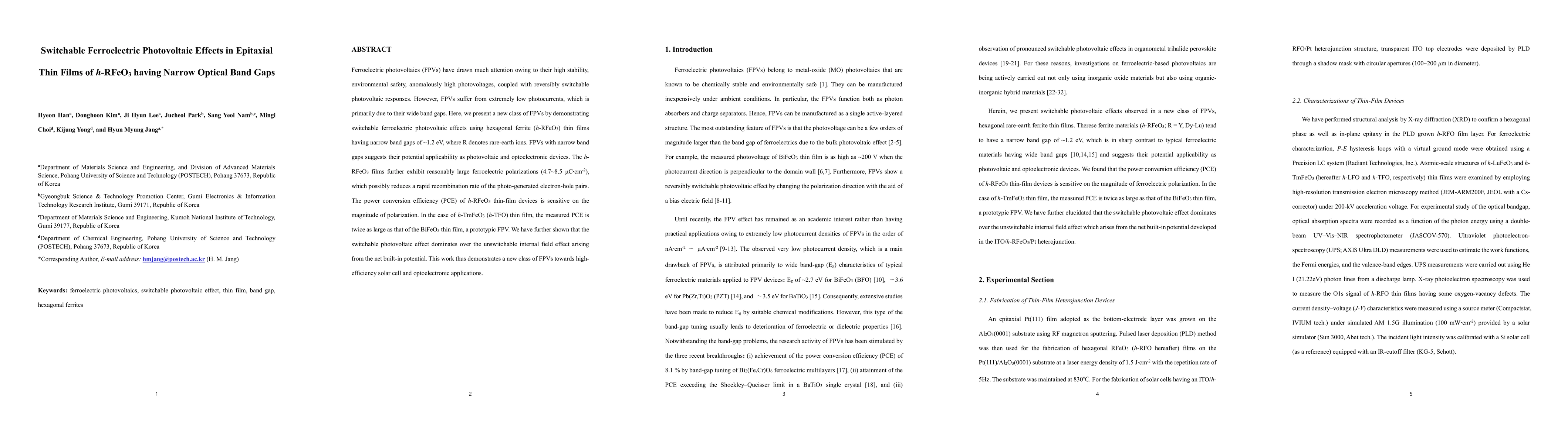 This paper introduces a novel class of ferroelectric photovoltaics (FPVs) using epitaxial thin films of h-RFeO3 with narrow optical band gaps (~1.2 eV), significantly enhancing photocurrents. The demonstrated h-RFeO3 thin films exhibit high ferroelectric polarizations, leading to a power conversion efficiency (PCE) that is twice as large as that of BiFeO3, and show potential for high-efficiency solar cells and optoelectronic devices.