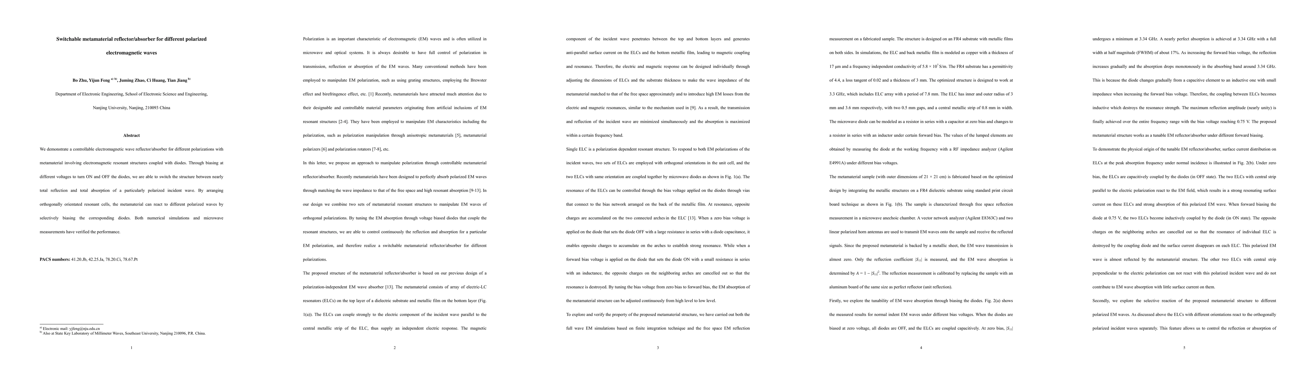 This paper presents a metamaterial that can switch between reflecting and absorbing electromagnetic waves based on polarization, using resonant structures coupled with diodes. By adjusting the bias voltages, the metamaterial can be tuned to reflect or absorb specific polarized waves, verified through simulations and microwave measurements.