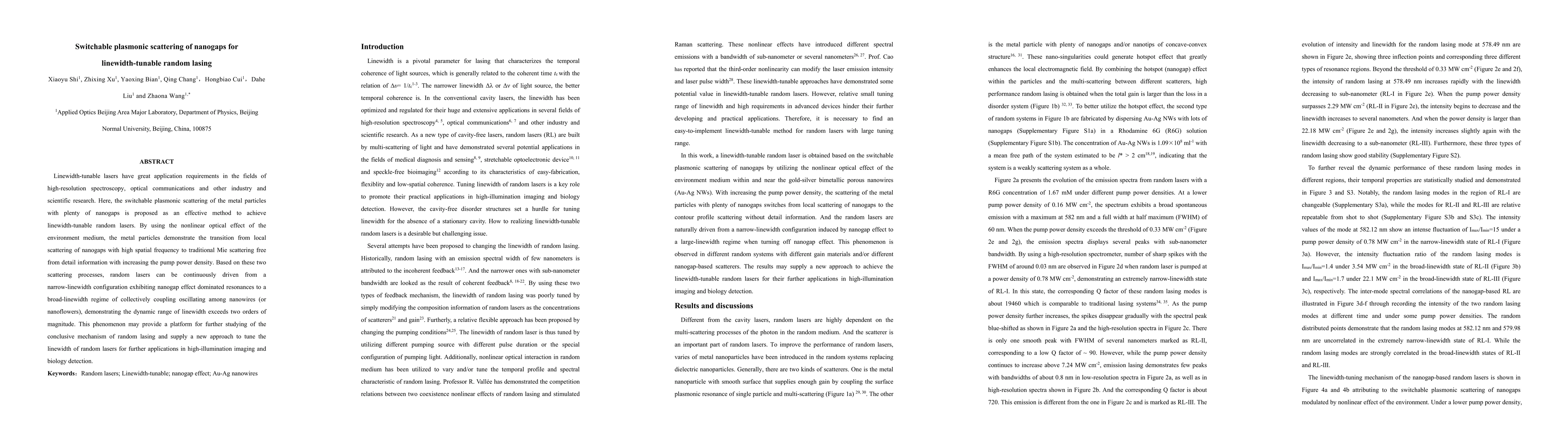 This paper proposes a method for achieving linewidth-tunable random lasers through switchable plasmonic scattering of metal particles with nanogaps. The transition from nanogap-dominated scattering to collective Mie scattering enables a dynamic range of linewidth exceeding two orders of magnitude, offering potential applications in high-resolution imaging and biological detection.