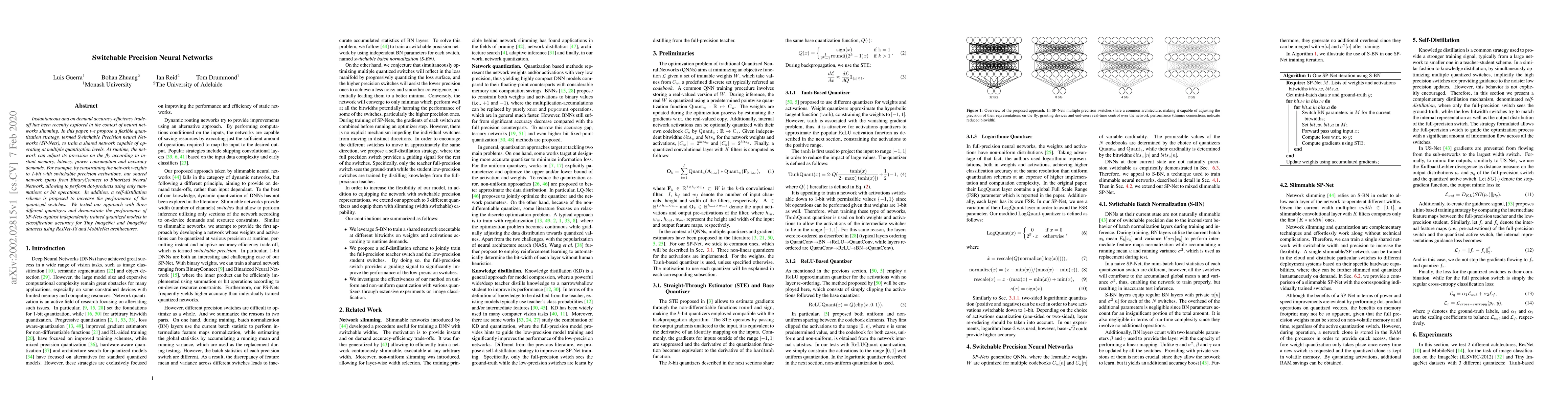 The paper introduces Switchable Precision Neural Networks (SP-Nets), a method enabling a shared network to operate at multiple quantization levels, adjusting precision at runtime based on memory, latency, power, and accuracy needs. The approach spans from BinaryConnect to Binarized Neural Networks, and includes a self-distillation scheme to boost performance. Testing on Tiny ImageNet and ImageNet with ResNet-18 and MobileNet architectures shows improved classification accuracy compared to independently trained quantized models.