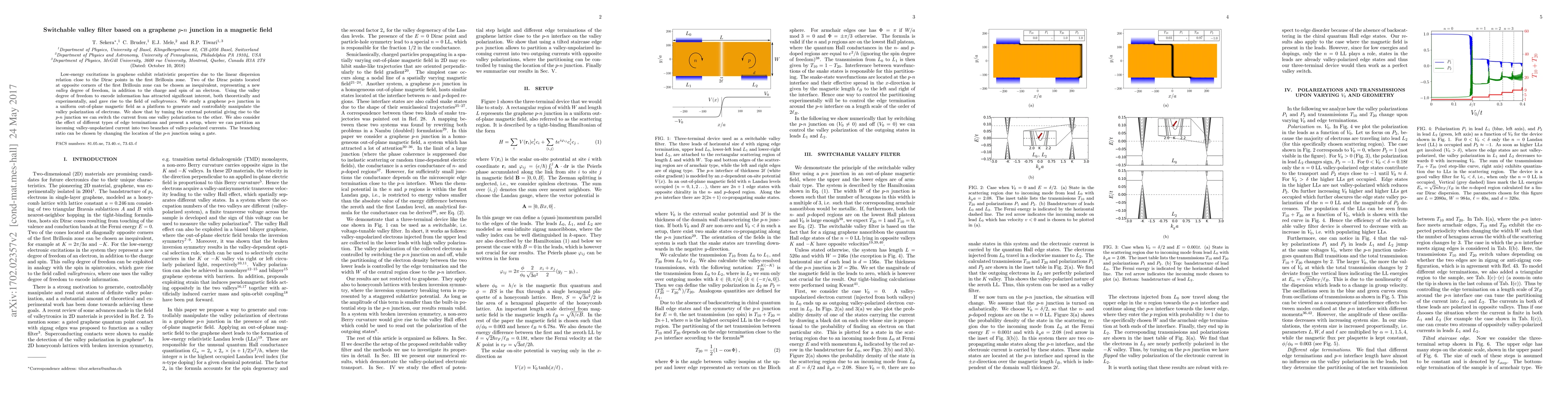 This paper investigates a graphene $p$-$n$ junction in a magnetic field as a valley filter, demonstrating the ability to switch current between valley polarizations by tuning the external potential. The study also explores edge terminations and presents a method to partition valley-unpolarized current into valley-polarized branches via a gate-controlled junction.