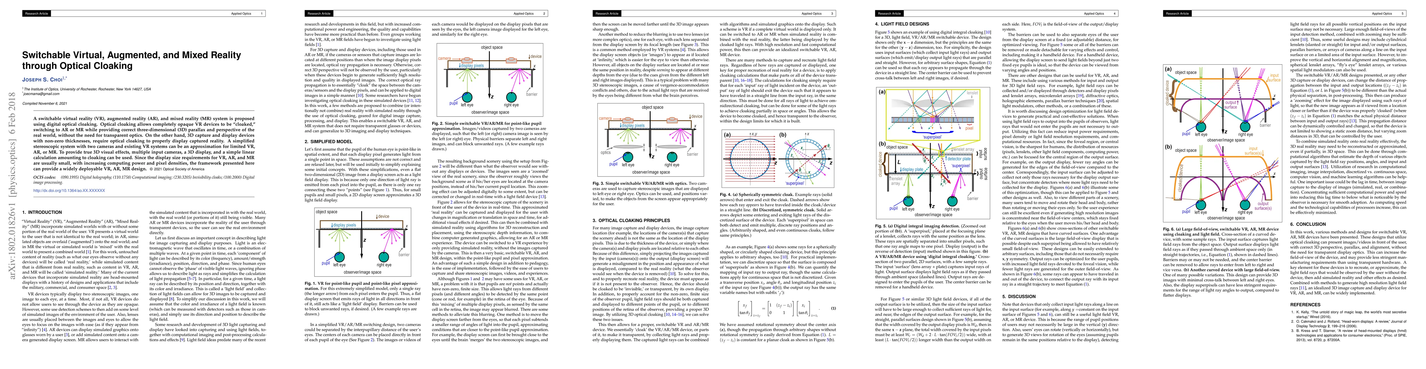A switchable virtual reality (VR), augmented reality (AR), and mixed reality (MR) system is proposed using digital optical cloaking. Optical cloaking allows completely opaque VR devices to be "cloaked," switching to AR or MR while providing correct three-dimensional (3D) parallax and perspective of the real world, without the need for transparent optics. On the other hand, 3D capture and display devices with non-zero thicknesses, require optical cloaking to properly display captured reality. A simplified stereoscopic system with two cameras and existing VR systems can be an approximation for limited VR, AR, or MR. To provide true 3D visual effects, multiple input cameras, a 3D display, and a simple linear calculation amounting to cloaking can be used. Since the display size requirements for VR, AR, and MR are usually small, with increasing computing power and pixel densities, the framework presented here can provide a widely deployable VR, AR, MR design.