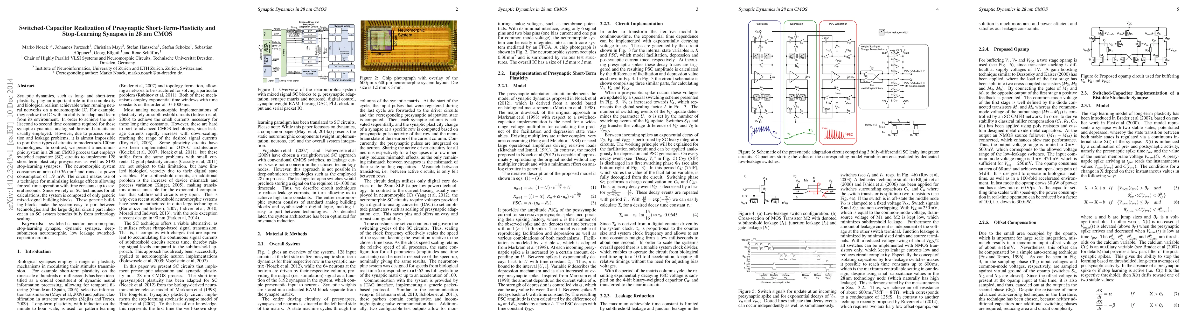 This paper presents a neuromorphic system in a 28 nm CMOS process that uses switched capacitor circuits to implement synaptic short-term plasticity and stop-learning synapses. The system achieves real-time operation with time constants up to several seconds, minimizing leakage effects and utilizing generic mixed-signal building blocks for easy technology porting.