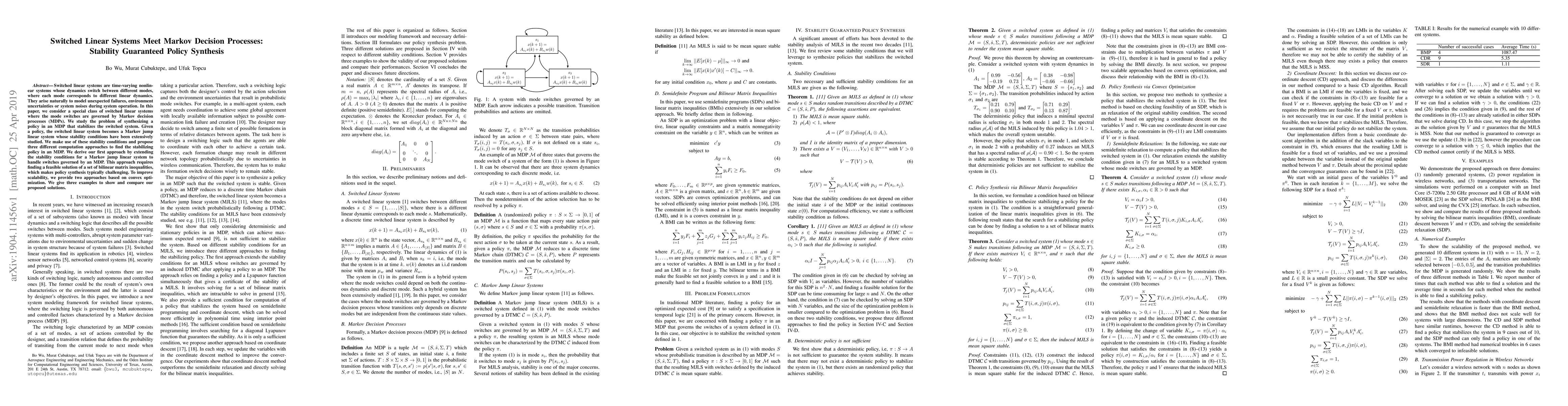 This paper explores the synthesis of stabilizing policies for switched linear systems governed by Markov decision processes (MDPs). It proposes three computational methods, including bilinear matrix inequalities and convex optimization techniques, to find such policies and demonstrates their effectiveness through examples.
