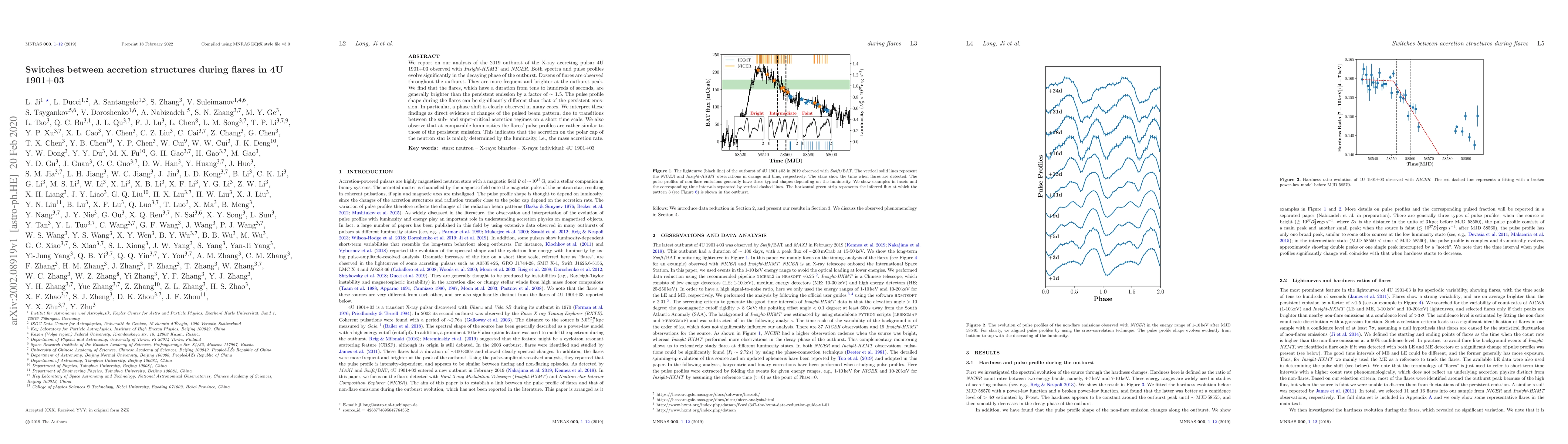 We report on our analysis of the 2019 outburst of the X-ray accreting pulsar 4U 1901+03 observed with Insight-HXMT and NICER. Both spectra and pulse profiles evolve significantly in the decaying phase of the outburst. Dozens of flares are observed throughout the outburst. They are more frequent and brighter at the outburst peak. We find that the flares, which have a duration from tens to hundreds of seconds, are generally brighter than the persistent emission by a factor of $\sim$ 1.5. The pulse profile shape during the flares can be significantly different than that of the persistent emission. In particular, a phase shift is clearly observed in many cases. We interpret these findings as direct evidence of changes of the pulsed beam pattern, due to transitions between the sub- and super-critical accretion regimes on a short time scale. We also observe that at comparable luminosities the flares' pulse profiles are rather similar to those of the persistent emission. This indicates that the accretion on the polar cap of the neutron star is mainly determined by the luminosity, i.e., the mass accretion rate.