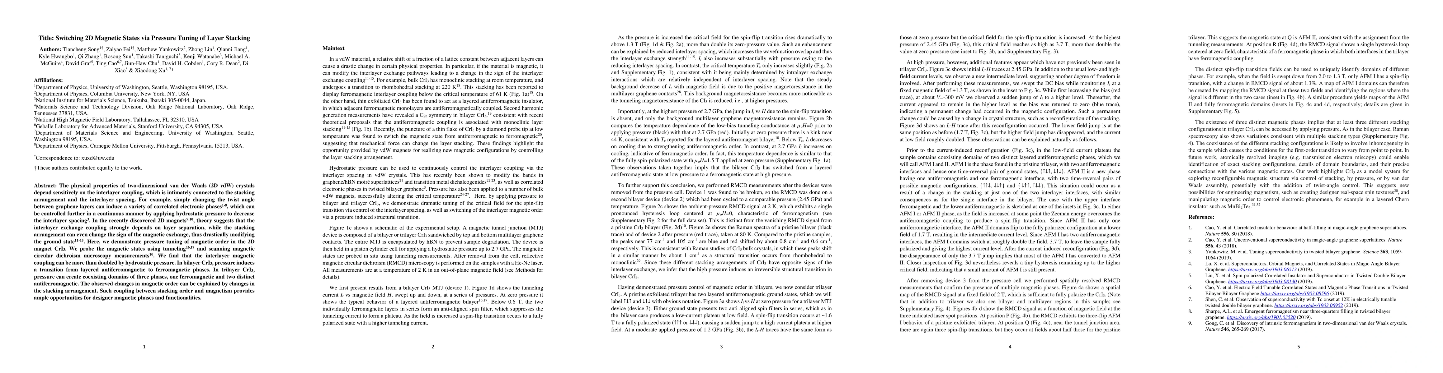 This paper demonstrates that pressure can significantly alter the magnetic states in 2D van der Waals crystals, specifically CrI3, by tuning interlayer coupling and stacking arrangements. The study reveals a transition from antiferromagnetic to ferromagnetic phases under pressure, highlighting the potential for creating new magnetic functionalities.