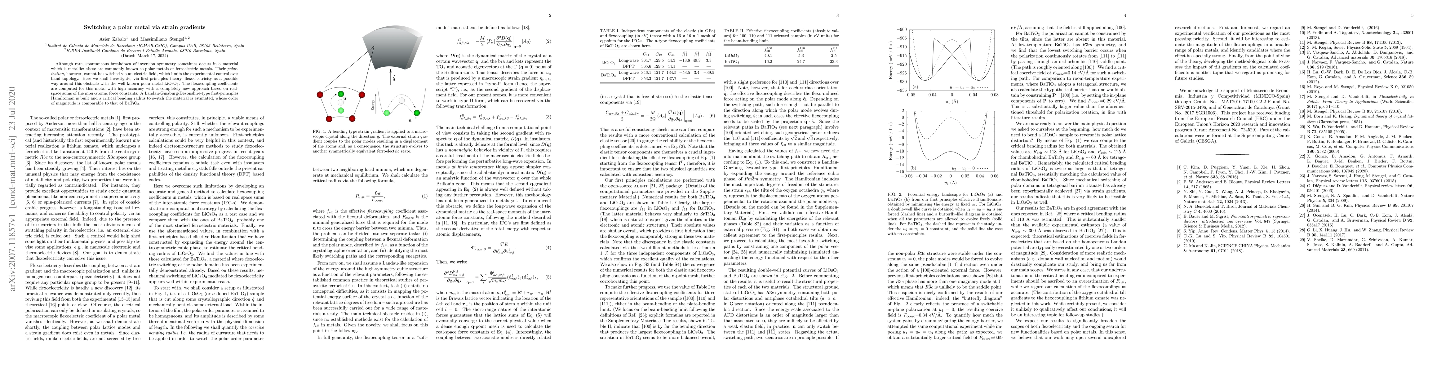 Although rare, spontaneous breakdown of inversion symmetry sometimes occurs in a material which is metallic: these are commonly known as polar metals or ferroelectric metals. Their 'polarization', however, cannot be switched via an electric field, which limits the experimental control over band topology. Here we shall investigate, via first-principles theory, flexoelectricity as a possible way around this obstacle with the well known polar metal LiOsO$_3$. The flexocoupling coefficients are computed for this metal with high accuracy with a completely new approach based on real-space sums of the inter-atomic force constants. A Landau-Ginzburg-Devonshire-type first-principles Hamiltonian is built and a critical bending radius to switch the material is estimated, whose order of magnitude is comparable to that of BaTiO$_3$.