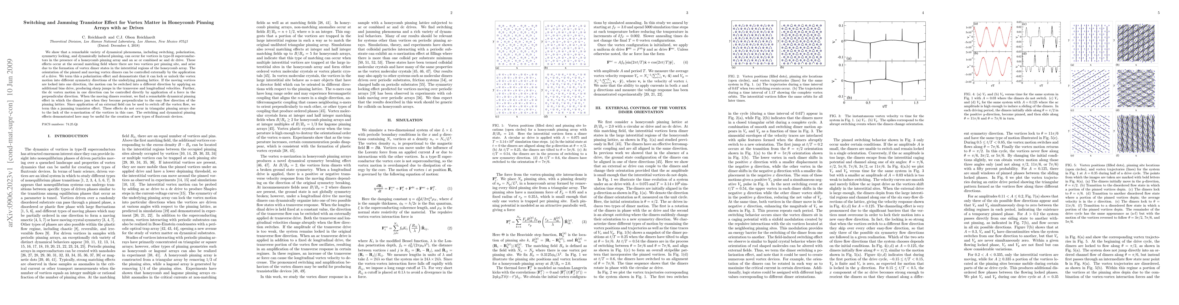 We show that a remarkable variety of dynamical phenomena, including switching, polarization, symmetry locking, and dynamically induced pinning, can occur for vortices in type-II superconductors in the presence of a honeycomb pinning array and an ac or combined ac and dc drive. These effects occur at the second matching field where there are two vortices per pinning site, and arise due to the formation of vortex dimer states in the interstitial regions of the honeycomb array. The orientation of the pinned and moving vortex dimers can be controlled externally by the application of a drive. We term this a polarization effect and demonstrate that it can lock or unlock the vortex motion into different symmetry directions of the underlying pinning lattice. If the moving vortices are locked into one direction, the motion can be switched into a different direction by applying an additional bias drive, producing sharp jumps in the transverse and longitudinal velocities. Further, the dc vortex motion in one direction can be controlled directly by application of a force in the perpendicular direction. When the moving dimers reorient, we find a remarkable dynamical pinning effect in which the dimers jam when they become perpendicular to the easy flow direction of the pinning lattice. Since application of an external field can be used to switch off the vortex flow, we term this a jamming transistor effect. These effects do not occur in triangular pinning arrays due to the lack of the n-merization of the vortices in this case. The switching and dynamical pinning effects demonstrated here may be useful for the creation of new types of fluxtronic devices.