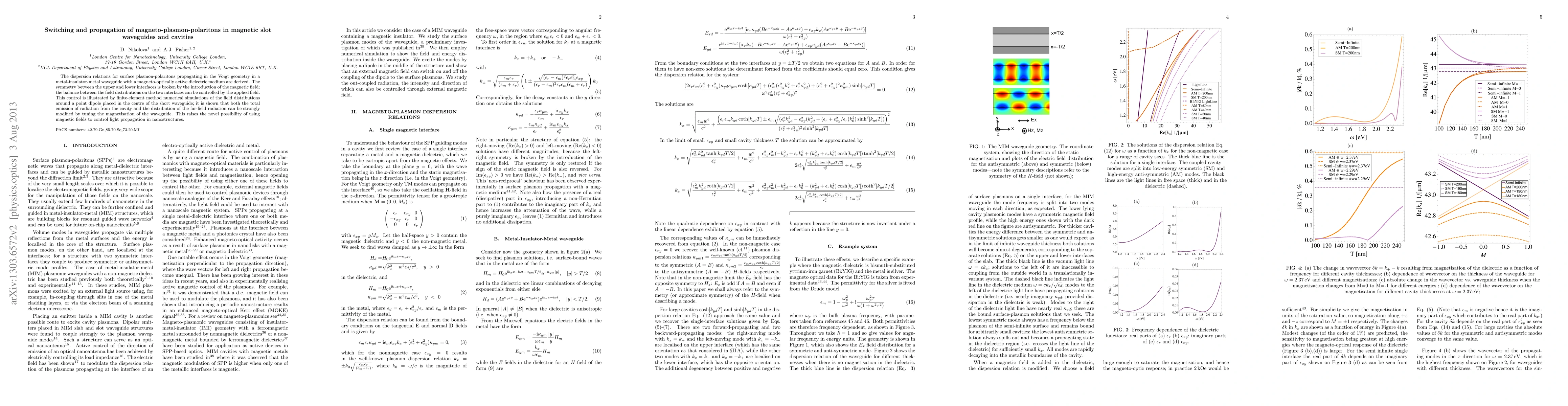 The dispersion relations for surface plasmon-polaritons propagating in the Voigt geometry in a metal-insulator-metal waveguide with a magneto-optically active dielectric medium are derived. The symmetry between the upper and lower interfaces is broken by the introduction of the magnetic field; the balance between the field distributions on the two interfaces can be controlled by the applied field. This control is illustrated by finite-element method numerical simulations of the field distributions around a point dipole placed in the centre of the short waveguide; it is shown that both the total emission of radiation from the cavity and the distribution of the far-field radiation can be strongly modified by tuning the magnetisation of the waveguide. This raises the novel possibility of using magnetic fields to control light propagation in nanostructures.
