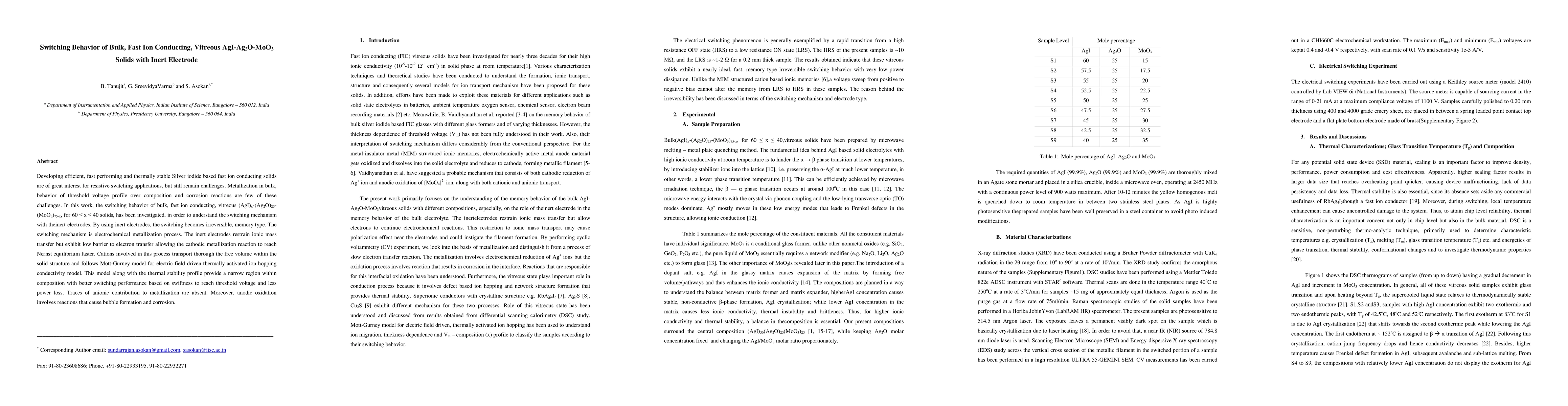 Developing efficient, fast performing and thermally stable Silver iodide based fast ion conducting solids are of great interest for resistive switching applications, but still remain challenges. Metallization in bulk, behavior of threshold voltage profile over composition and corrosion reactions are few of these challenges. In this work, the switching behavior of bulk, fast ion conducting, vitreous (AgI)x-(Ag2O)25-(MoO3)75-x, for 60 < x < 40 solids, has been investigated, in order to understand the switching mechanism with theinert electrodes. By using inert electrodes, the switching becomes irreversible, memory type. The switching mechanism is electrochemical metallization process. The inert electrodes restrain ionic mass transfer but exhibit low barrier to electron transfer allowing the cathodic metallization reaction to reach Nernst equilibrium faster. Cations involved in this process transport thorough the free volume within the solid structure and follows Mott-Gurney model for electric field driven thermally activated ion hopping conductivity model. This model along with the thermal stability profile provide a narrow region within composition with better switching performance based on swiftness to reach threshold voltage and less power loss. Traces of anionic contribution to metallization are absent. Moreover, anodic oxidation involves reactions that cause bubble formation and corrosion.