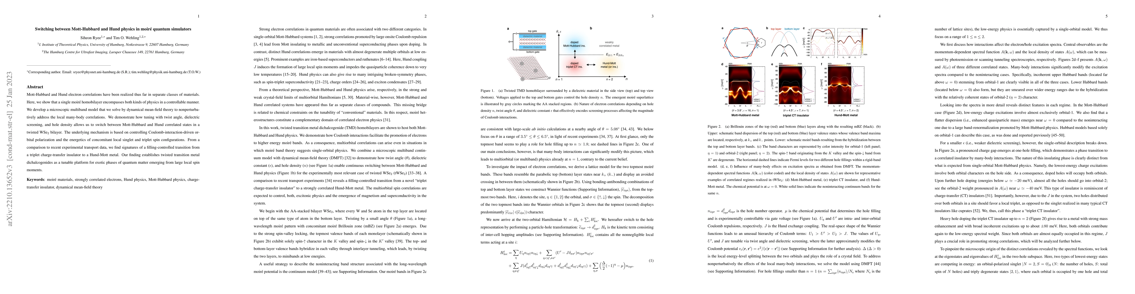 Mott-Hubbard and Hund electron correlations have been realized thus far in separate classes of materials. Here, we show that a single moir\'e homobilayer encompasses both kinds of physics in a controllable manner. We develop a microscopic multiband model that we solve by dynamical mean-field theory to nonperturbatively address the local many-body correlations. We demonstrate how tuning with twist angle, dielectric screening, and hole density allows us to switch between Mott-Hubbard and Hund correlated states in a twisted WSe$_2$ bilayer. The underlying mechanism is based on controlling Coulomb-interaction-driven orbital polarization and the energetics of concomitant local singlet and triplet spin configurations. From a comparison to recent experimental transport data, we find signatures of a filling-controlled transition from a triplet charge-transfer insulator to a Hund-Mott metal. Our finding establishes twisted transition metal dichalcogenides as a tunable platform for exotic phases of quantum matter emerging from large local spin moments.
