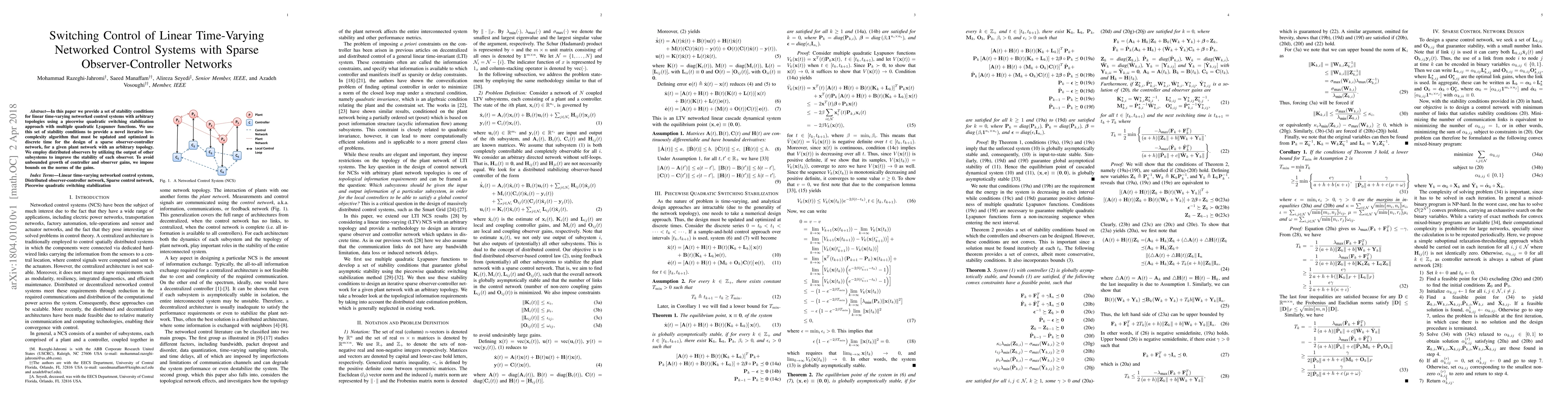 This paper presents stability conditions for linear time-varying networked control systems using a switching stabilization approach with multiple Lyapunov functions. It introduces a low-complexity algorithm for designing sparse observer-controller networks, employing distributed observers to enhance stability while imposing bounds on gains to prevent unbounded growth.
