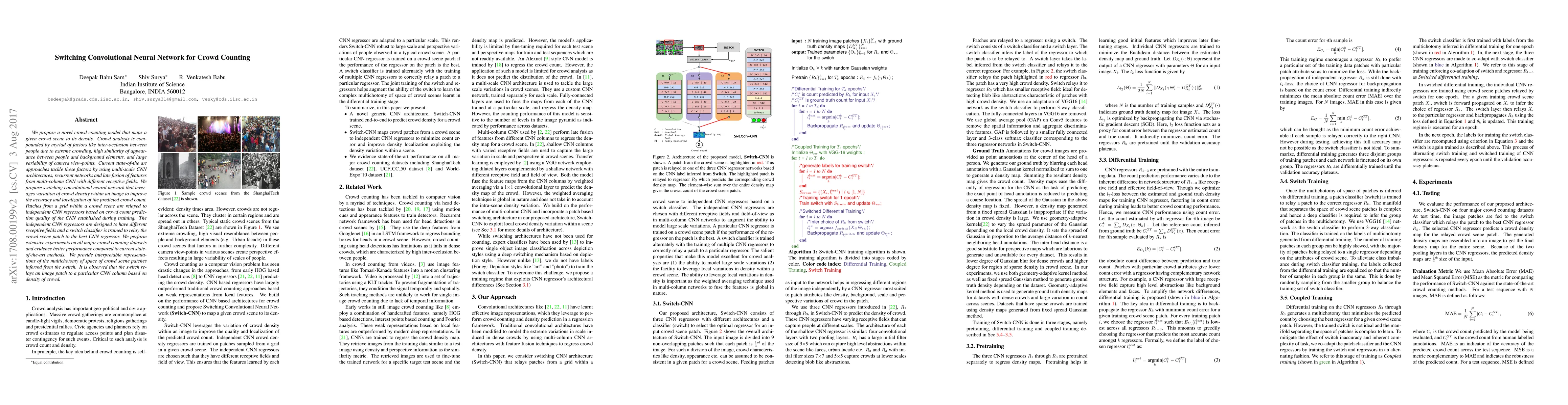 This paper introduces a switching convolutional neural network for crowd counting that dynamically selects the best CNN regressor based on crowd density, achieving superior accuracy and localization compared to existing methods. The model uses different CNN regressors with varied receptive fields and a switch classifier to optimize crowd count predictions.