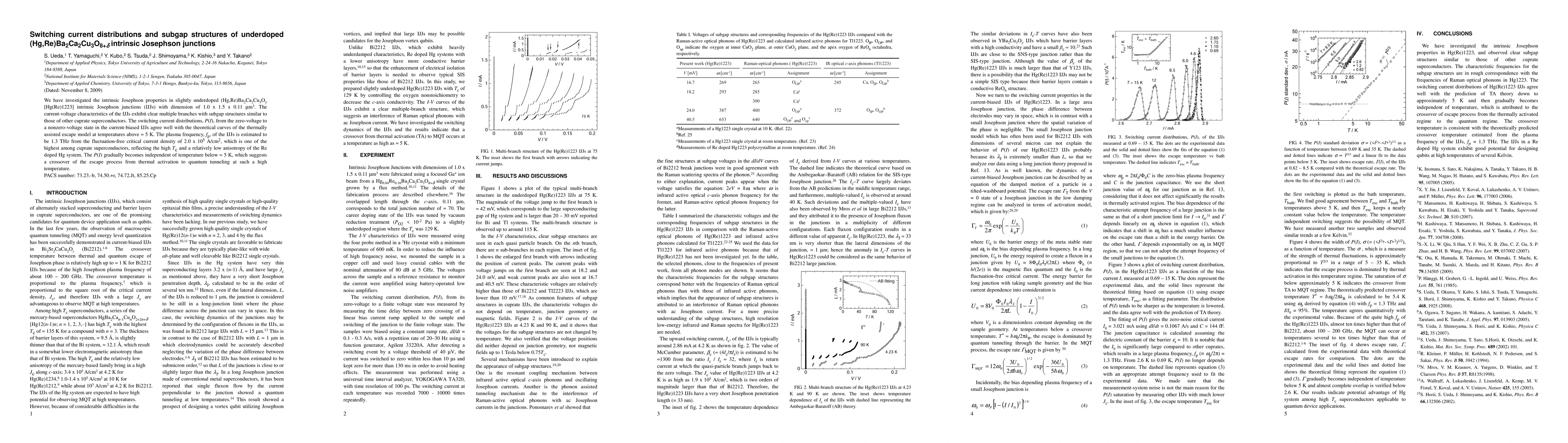 This study investigates the intrinsic Josephson properties in underdoped (Hg,Re)Ba2Ca2Cu3Oy IJJs, revealing multiple current-voltage branches with subgap structures. The switching current distributions align with thermal escape models above 5 K, indicating a transition to quantum tunneling at lower temperatures.