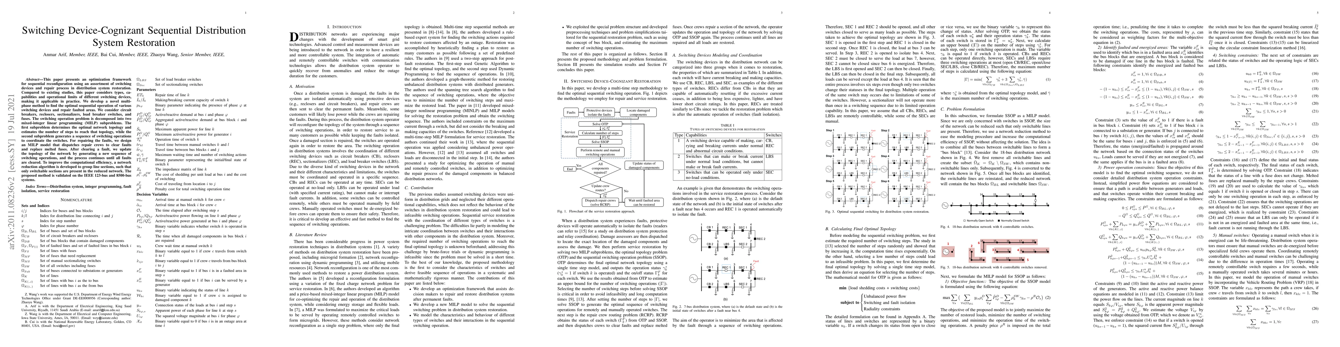 This paper presents an optimization framework for sequential reconfiguration using an assortment of switching devices and repair process in distribution system restoration. Compared to existing studies, this paper considers types, capabilities and operational limits of different switching devices, making it applicable in practice. We develop a novel multi-phase method to find the optimal sequential operation of various switching devices and repair faulted areas. We consider circuit breakers, reclosers, sectionalizers, load breaker switches, and fuses. The switching operation problem is decomposed into two mixed-integer linear programming (MILP) subproblems. The first subproblem determines the optimal network topology and estimates the number of steps to reach that topology, while the second subproblem generates a sequence of switching operations to coordinate the switches. For repairing the faults, we design an MILP model that dispatches repair crews to clear faults and replace melted fuses. After clearing a fault, we update the topology of the network by generating a new sequence of switching operations, and the process continues until all faults are cleared. To improve the computational efficiency, a network reduction algorithm is developed to group line sections, such that only switchable sections are present in the reduced network. The proposed method is validated on the IEEE 123-bus and 8500-bus systems.