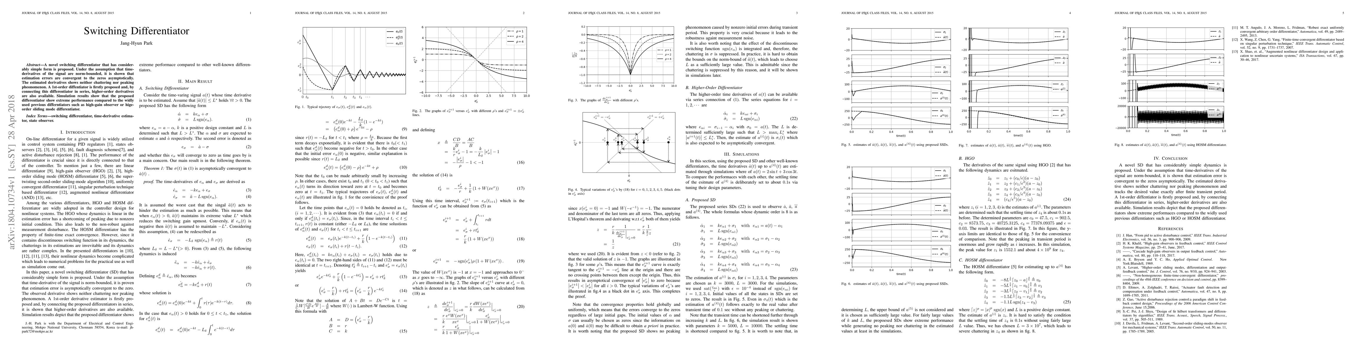 A novel switching differentiator with simple form is proposed, showing asymptotic convergence of estimation errors to zero without chattering or peaking phenomena. It outperforms widely used methods in simulations.