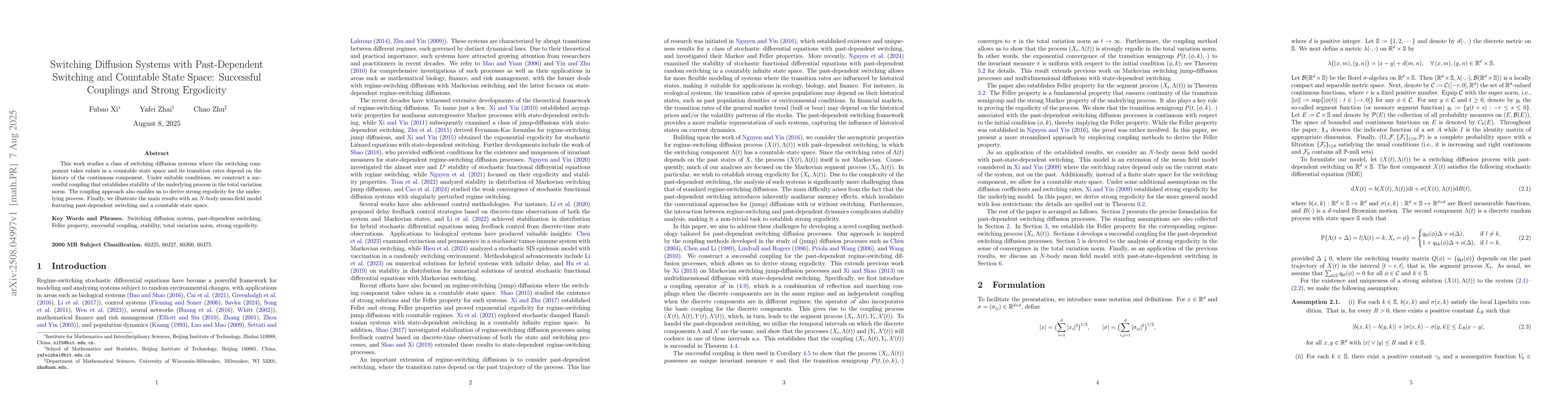 This work studies a class of switching diffusion systems where the switching component takes values in a countable state space and its transition rates depend on the history of the continuous component. Under suitable conditions, we construct a successful coupling that establishes stability of the underlying process in the total variation norm. The coupling approach also enables us to derive strong ergodicity for the underlying process. Finally, we illustrate the main results with an $N$-body mean-field model featuring past-dependent switching and a countable state space.