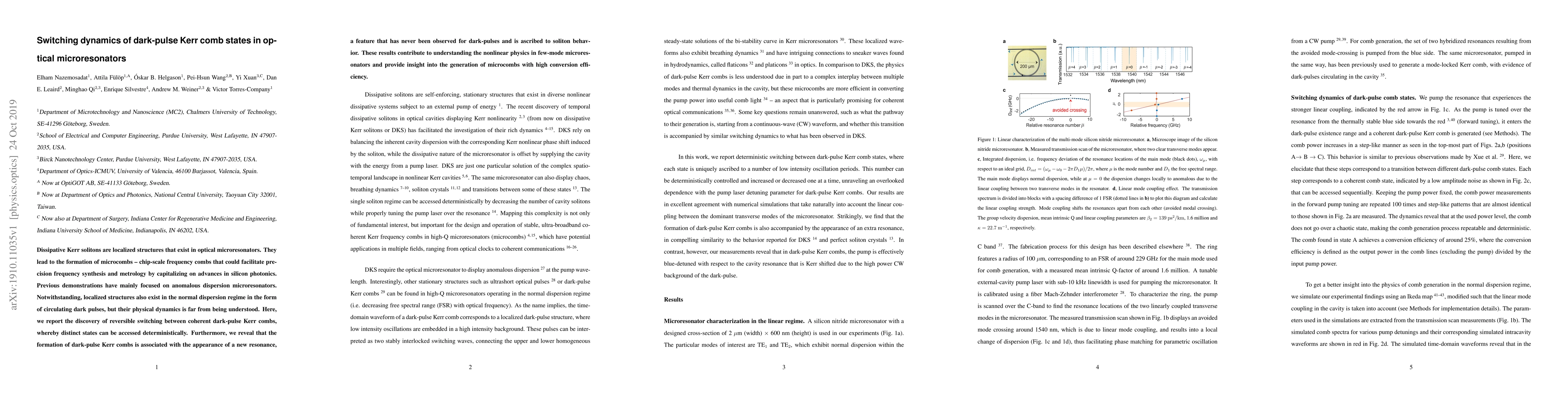 This paper reports on the reversible switching dynamics between coherent dark-pulse Kerr combs in optical microresonators, highlighting a new resonance phenomenon linked to soliton behavior that has not been previously observed for dark pulses. The findings advance understanding of nonlinear physics in few-mode microresonators and improve microcomb generation efficiency.