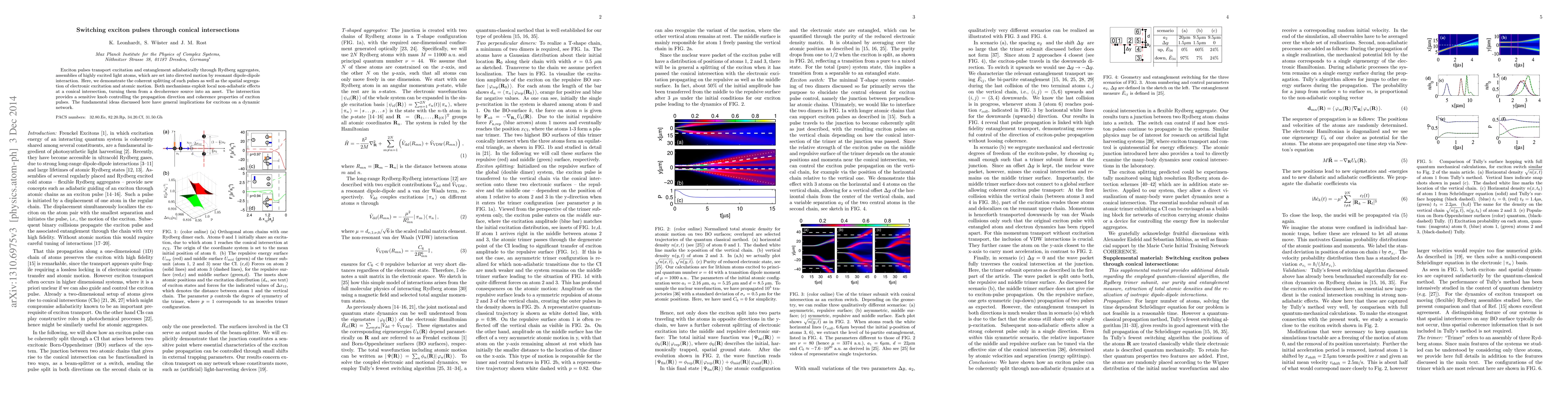 Exciton pulses transport excitation and entanglement adiabatically through Rydberg aggregates, assemblies of highly excited light atoms, which are set into directed motion by resonant dipole-dipole interaction. Here, we demonstrate the coherent splitting of such pulses as well as the spatial segregation of electronic excitation and atomic motion. Both mechanisms exploit local nonadiabatic effects at a conical intersection, turning them from a decoherence source into an asset. The intersection provides a sensitive knob controlling the propagation direction and coherence properties of exciton pulses. The fundamental ideas discussed here have general implications for excitons on a dynamic network.