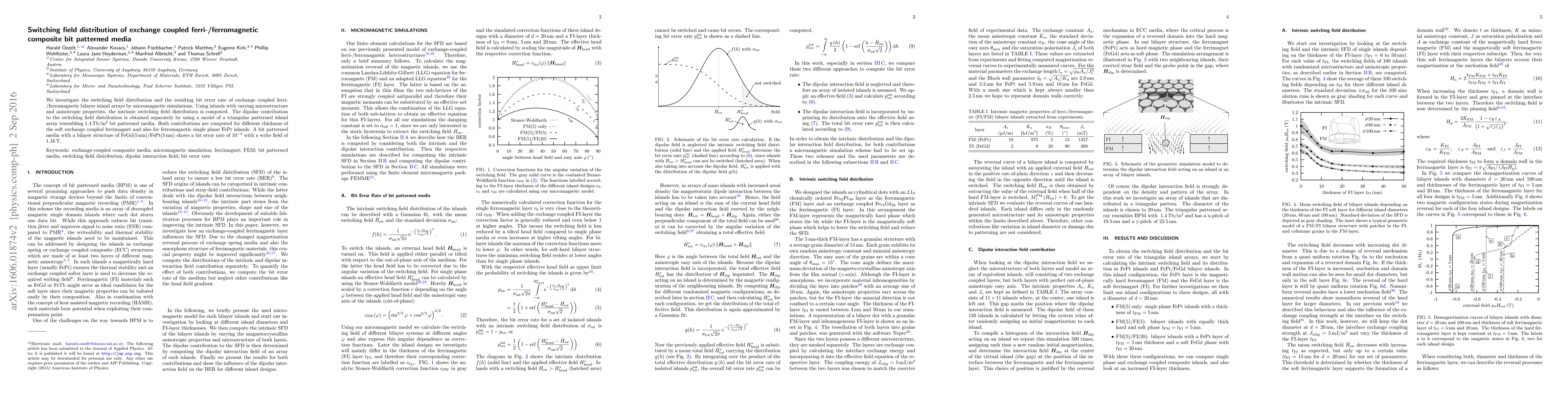 This study uses micromagnetic simulations to analyze the switching field distribution and bit error rate of exchange-coupled ferri-/ferromagnetic bilayer island arrays in patterned media. The research finds that a bilayer structure of FeGd/FePt exhibits a low bit error rate of $10^{-4}$ at a write field of $1.16\,\mathrm{T}$.