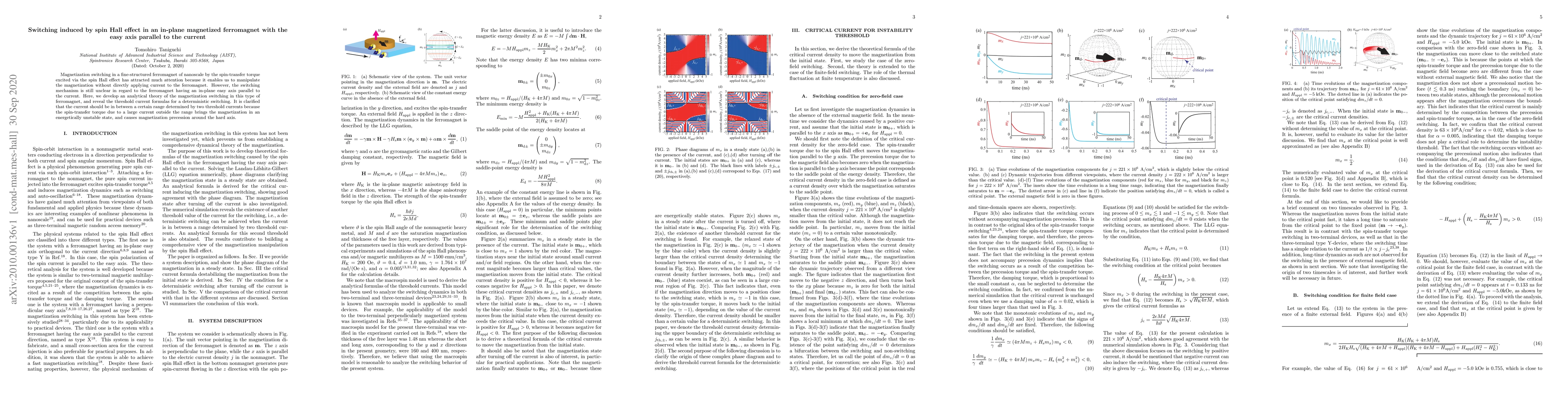 This paper develops an analytical theory to explain magnetization switching in an in-plane magnetized ferromagnet driven by the spin Hall effect, revealing the threshold current range for deterministic switching. It clarifies that excessive current leads to an unstable state and precession around the hard axis.