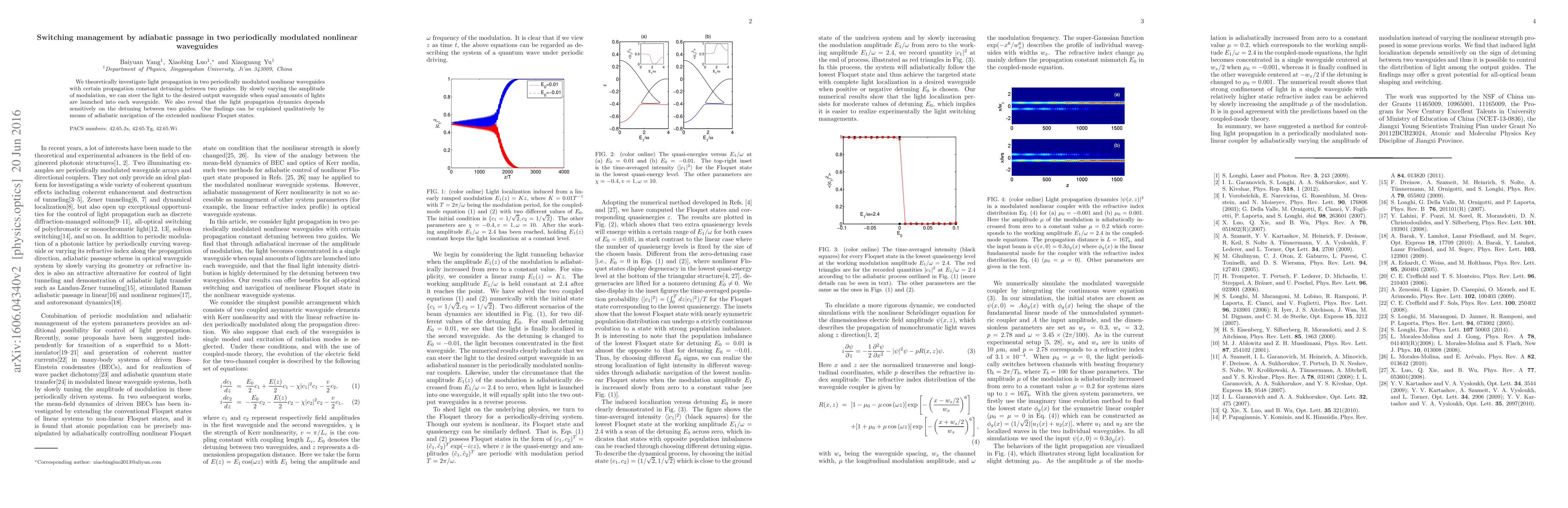 This paper explores light propagation in two periodically modulated nonlinear waveguides, demonstrating that by gradually adjusting modulation amplitude, light can be directed to the desired output waveguide. The study reveals that light dynamics depend critically on the detuning between the guides, which can be explained via adiabatic navigation of extended nonlinear Floquet states.