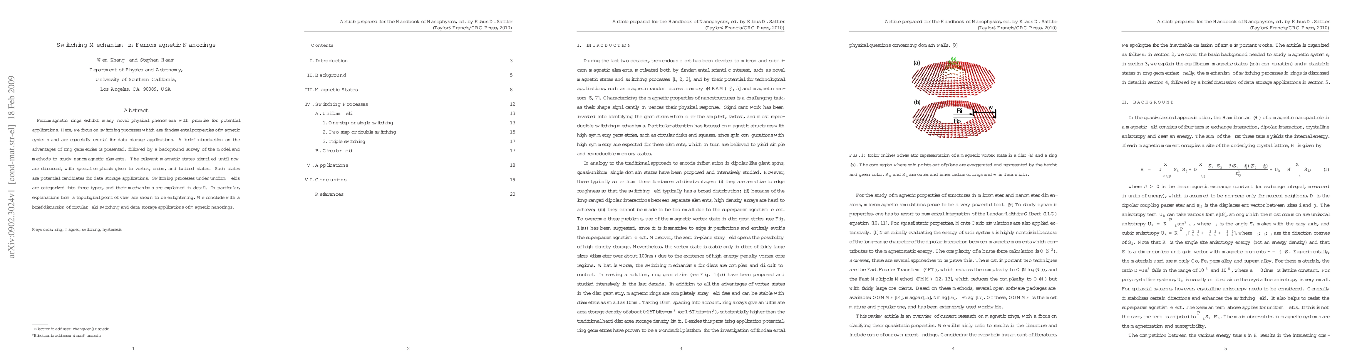This paper explores the switching mechanisms in ferromagnetic nanorings, emphasizing their potential for data storage applications. It categorizes switching processes under uniform fields and explains their mechanisms, particularly from a topological perspective, highlighting vortex, onion, and twisted states as promising candidates for storage.