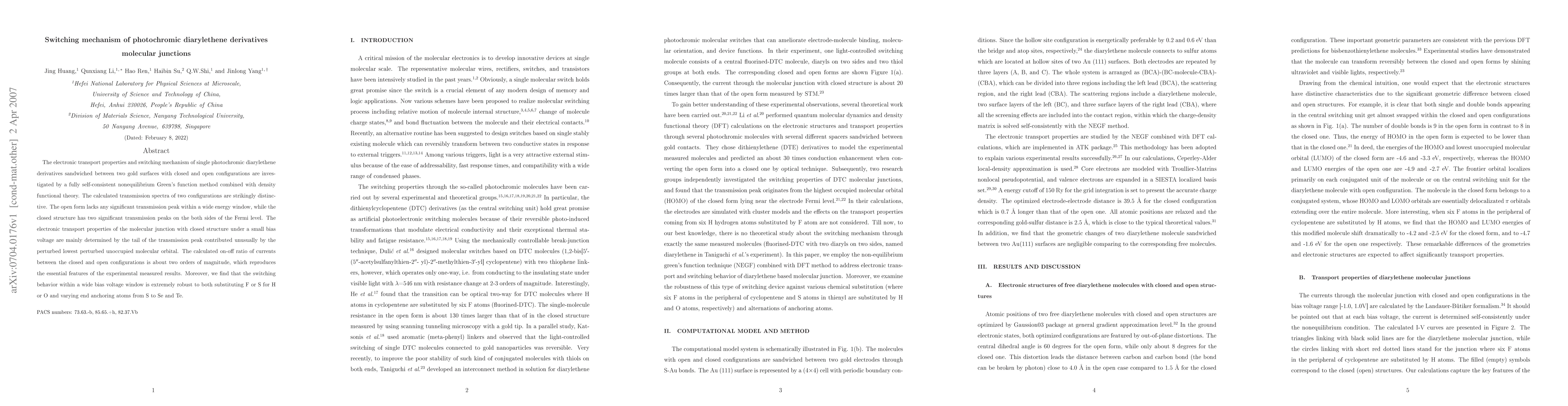 This paper investigates the electronic transport and switching mechanisms of photochromic diarylethene derivatives in molecular junctions using a nonequilibrium Green's function method. The study reveals that the closed form exhibits significant transmission peaks, while the open form lacks them, resulting in a large on-off current ratio, and demonstrates robustness in switching behavior under various substitutions and anchoring atoms.