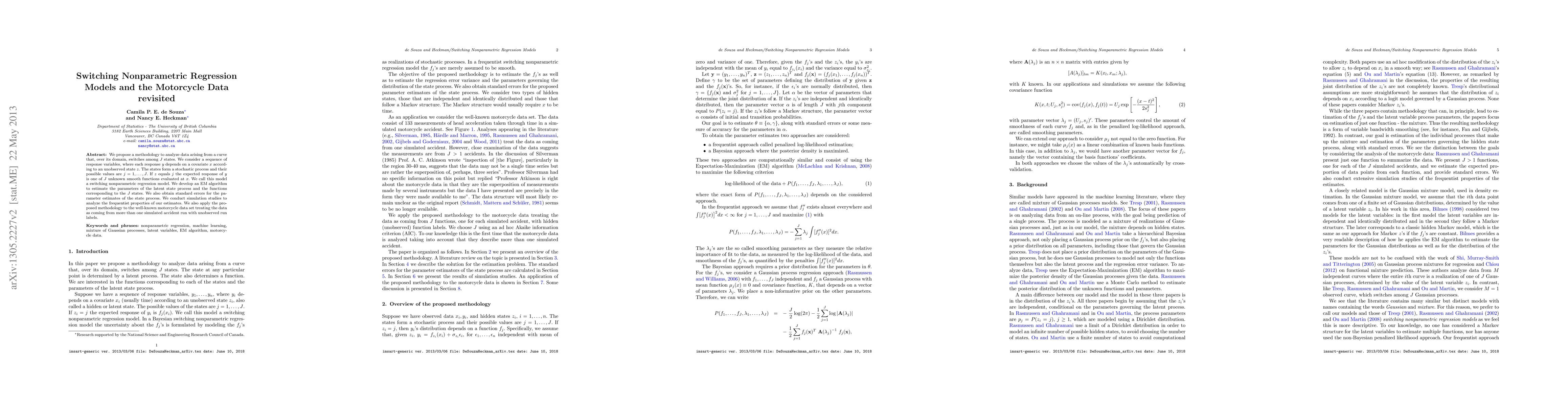 This paper introduces a switching nonparametric regression model to analyze data that switches among J states, employing an EM algorithm to estimate parameters and functions. The methodology is applied to the motorcycle data set, treating it as arising from multiple accident runs with unobserved labels.