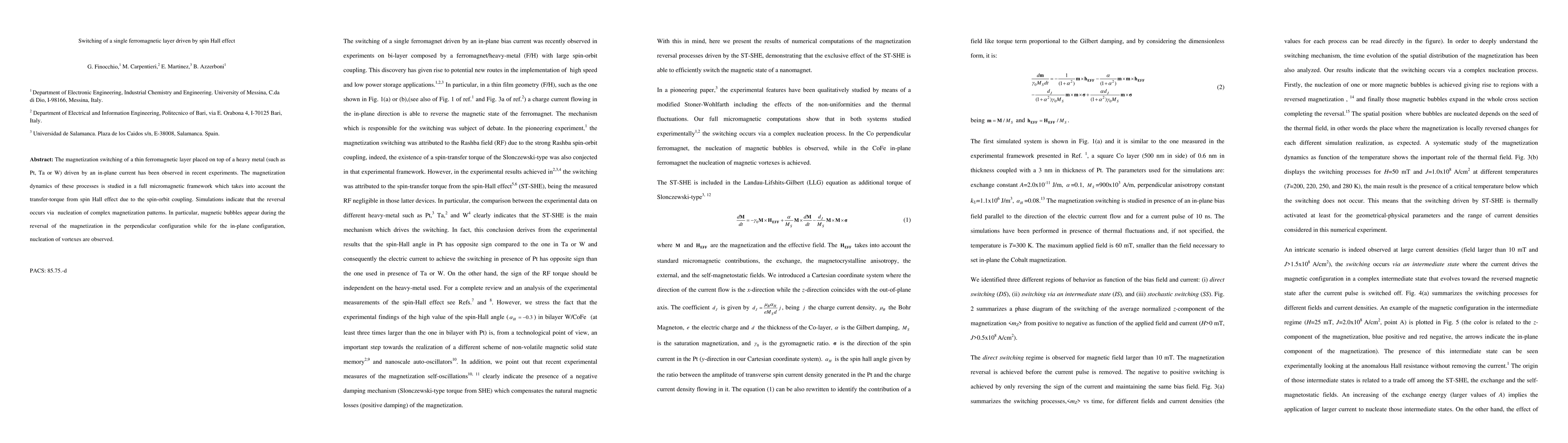 This research uses micromagnetic simulations to study magnetization switching in thin ferromagnetic layers on heavy metals, driven by in-plane current. It finds that switching occurs via complex pattern nucleation, with magnetic bubbles forming for perpendicular configurations and vortexes for in-plane configurations, highlighting the role of spin Hall effect in magnetization dynamics.