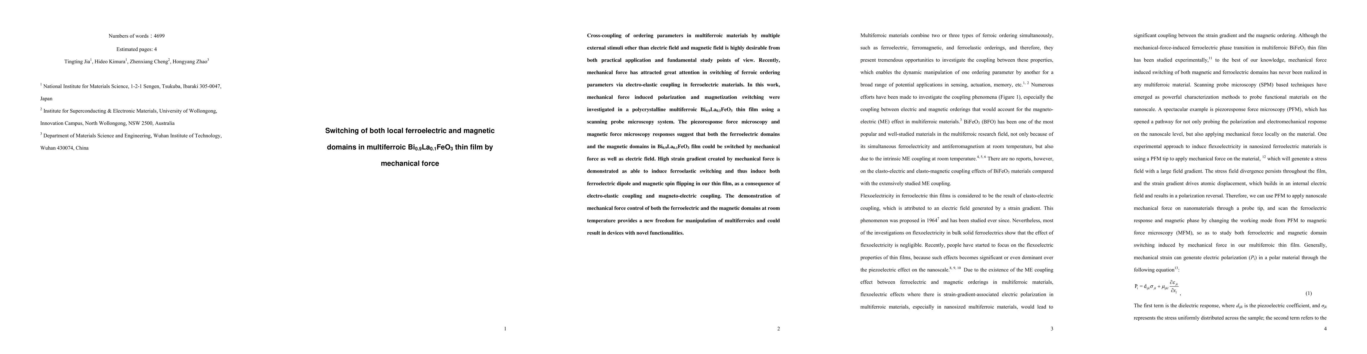 Summary: Mechanical force can switch both ferroelectric and magnetic domains in a polycrystalline Bi0.9La0.1FeO3 thin film at room temperature, demonstrating a novel method of domain manipulation via electro-elastic coupling, expanding potential applications for multiferroic devices.