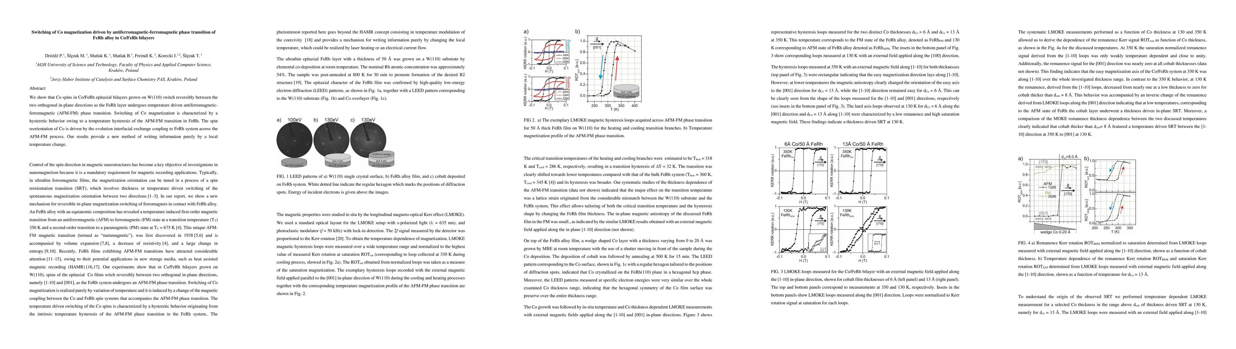 This paper demonstrates reversible switching of Co magnetization in Co/FeRh bilayers due to the temperature-induced antiferromagnetic-ferromagnetic phase transition in FeRh, showcasing a new method for information writing via localized temperature changes. The hysteretic behavior of Co spin reorientation is attributed to the temperature hysteresis of the FeRh transition.