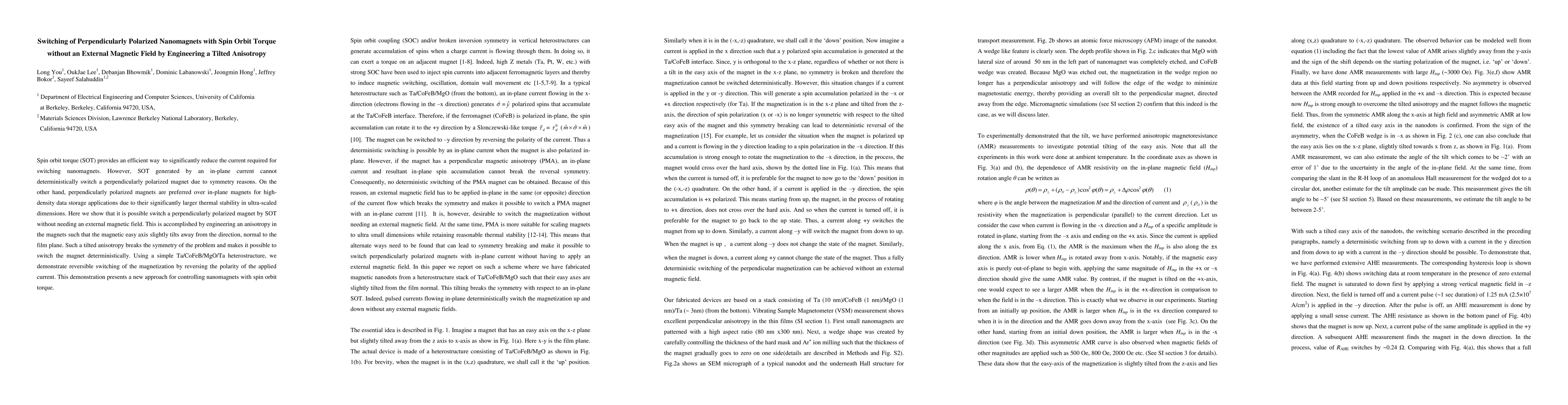 This paper demonstrates a method to switch perpendicularly polarized nanomagnets using spin orbit torque without an external magnetic field by engineering a tilted magnetic anisotropy. This approach breaks symmetry and enables deterministic switching, offering a new control technique for high-density data storage applications.