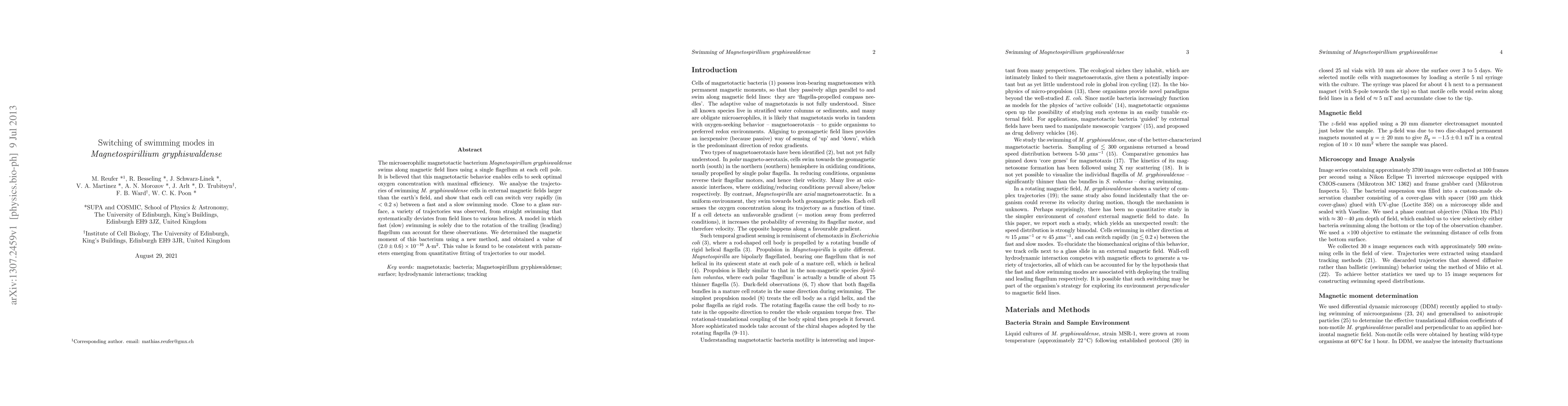 The microaerophilic magnetotactic bacterium Magnetospirillum gryphiswaldense swims along magnetic field lines using a single flagellum at each cell pole. It is believed that this magnetotactic behavior enables cells to seek optimal oxygen concentration with maximal efficiency. We analyse the trajectories of swimming M. gryphiswaldense cells in external magnetic fields larger than the earth's field, and show that each cell can switch very rapidly (in < 0.2 s) between a fast and a slow swimming mode. Close to a glass surface, a variety of trajectories was observed, from straight swimming that systematically deviates from field lines to various helices. A model in which fast (slow) swimming is solely due to the rotation of the trailing (leading) flagellum can account for these observations. We determined the magnetic moment of this bacterium using a new method, and obtained a value of (2.0 $\pm$ 0.6) $\times$ $10^{-16}$ Am$^2$. This value is found to be consistent with parameters emerging from quantitative fitting of trajectories to our model.