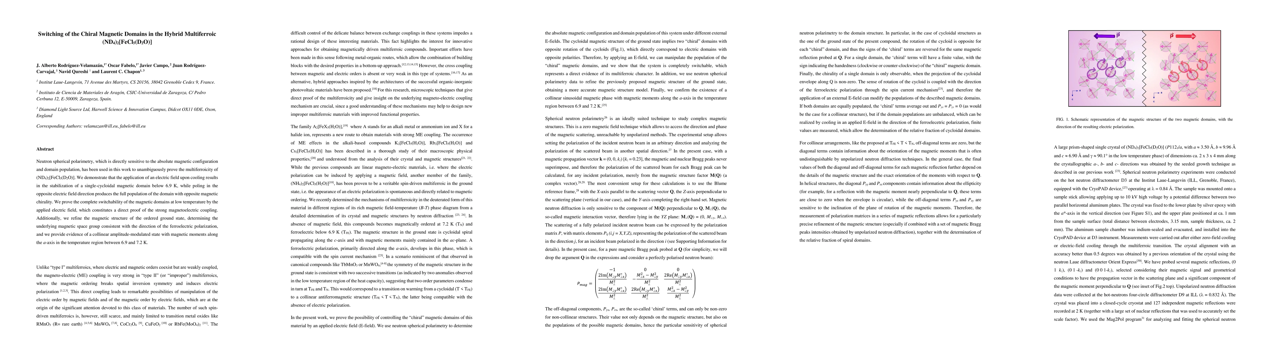 This paper demonstrates the multiferroicity of (ND4)2[FeCl5(D2O)] using neutron spherical polarimetry, showing that electric fields can switch chiral magnetic domains, revealing strong magnetoelectric coupling. The study also refines the magnetic structure, identifying a collinear amplitude-modulated state between 6.9 and 7.2 K.