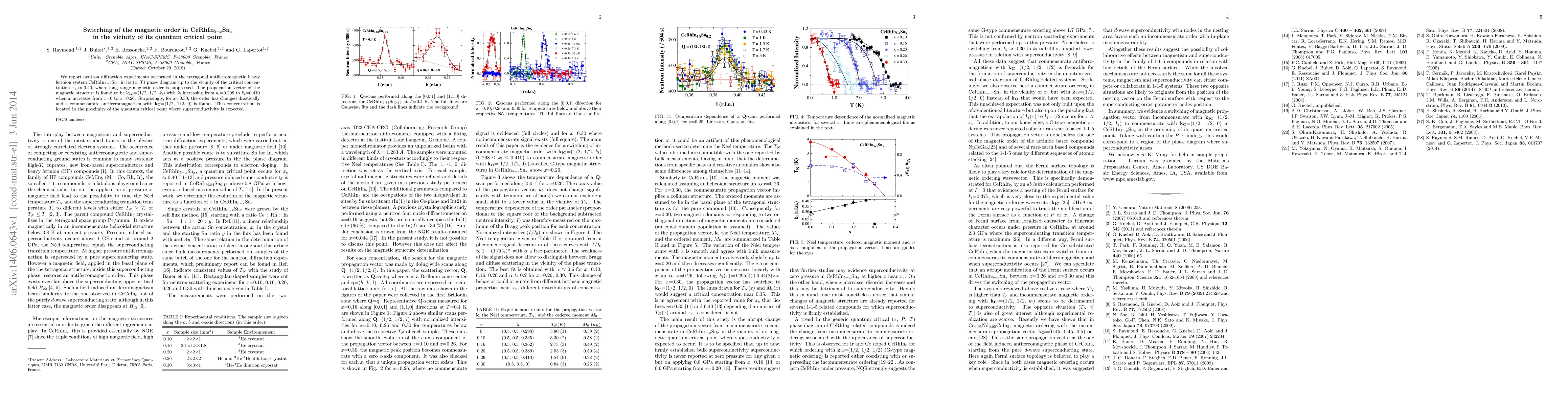 We report neutron diffraction experiments performed in the tetragonal antiferromagnetic heavy fermion system CeRhIn$_{5-x}$Sn$_{x}$ in its ($x$, $T$) phase diagram up to the vicinity of the critical concentration $x_c$ $\approx$ 0.40, where long range magnetic order is suppressed. The propagation vector of the magnetic structure is found to be $\bf{k_{IC}}$=(1/2, 1/2, $k_l$) with $k_l$ increasing from $k_l$=0.298 to $k_l$=0.410 when $x$ increases from $x$=0 to $x$=0.26. Surprisingly, for $x$=0.30, the order has changed drastically and a commensurate antiferromagnetism with $\bf{k_{C}}$=(1/2, 1/2, 0) is found. This concentration is located in the proximity of the quantum critical point where superconductivity is expected.