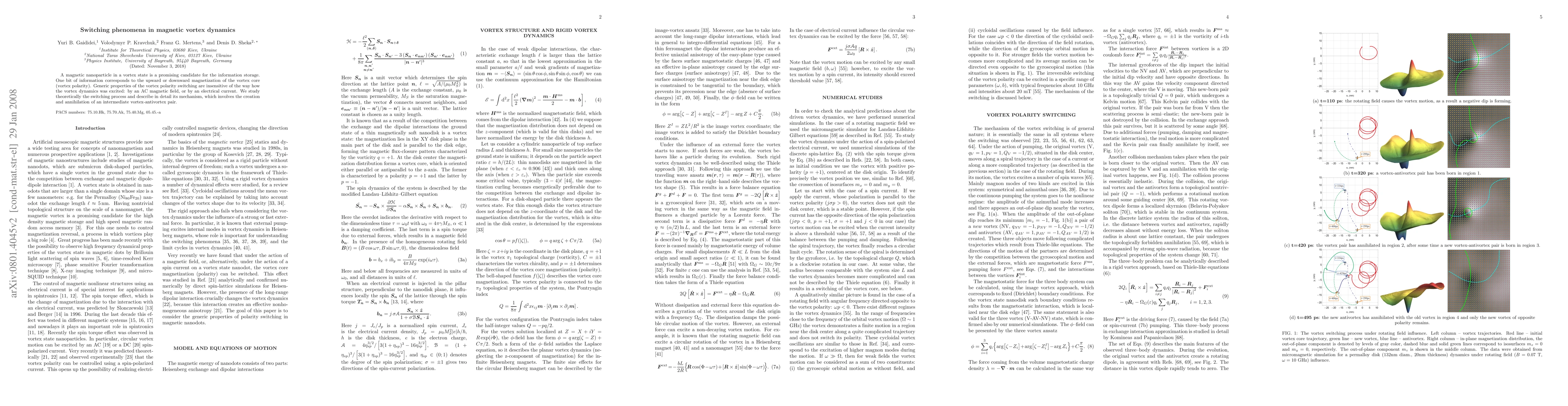 This paper investigates the switching phenomena in magnetic vortex dynamics, focusing on how the polarity of a magnetic nanoparticle's vortex state can be reversed. The study reveals that the switching mechanism, involving the creation and annihilation of a vortex-antivortex pair, is consistent regardless of the excitation method used.
