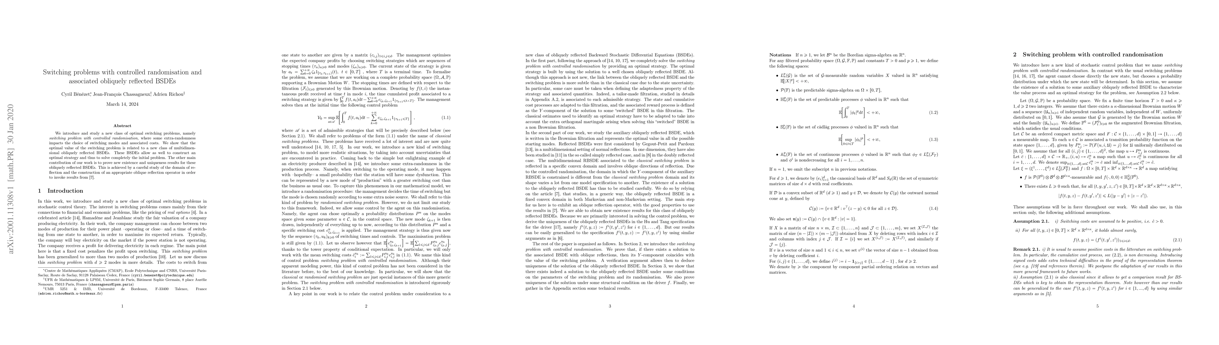We introduce and study a new class of optimal switching problems, namely switching problem with controlled randomisation, where some extra-randomness impacts the choice of switching modes and associated costs. We show that the optimal value of the switching problem is related to a new class of multidimensional obliquely reflected BSDEs. These BSDEs allow as well to construct an optimal strategy and thus to solve completely the initial problem. The other main contribution of our work is to prove new existence and uniqueness results for these obliquely reflected BSDEs. This is achieved by a careful study of the domain of reflection and the construction of an appropriate oblique reflection operator in order to invoke results from [7].