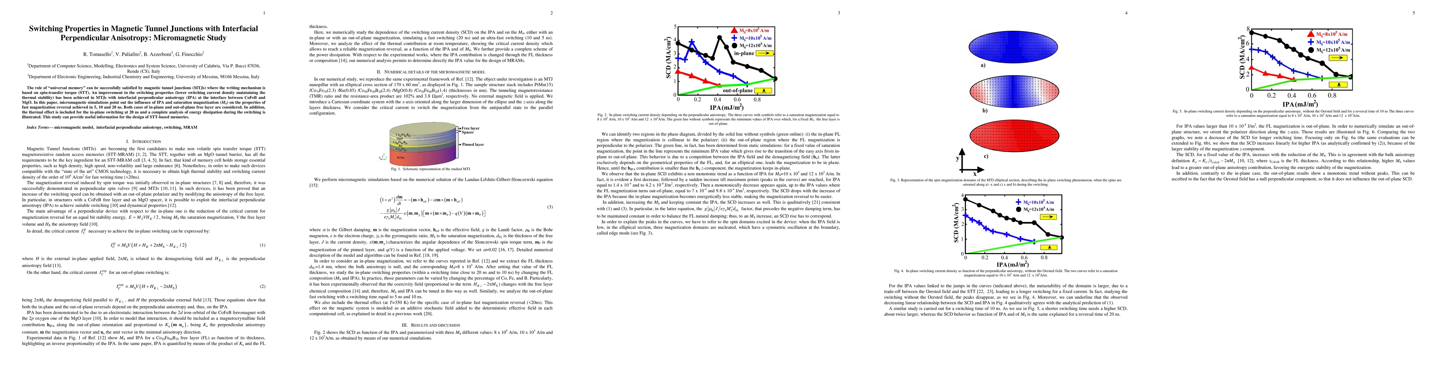 This paper investigates the switching properties of magnetic tunnel junctions with interfacial perpendicular anisotropy using micromagnetic simulations, focusing on lower switching current density and thermal stability. The study highlights the influence of anisotropy and saturation magnetization on fast magnetization reversal, with a detailed analysis of energy dissipation and thermal effects.