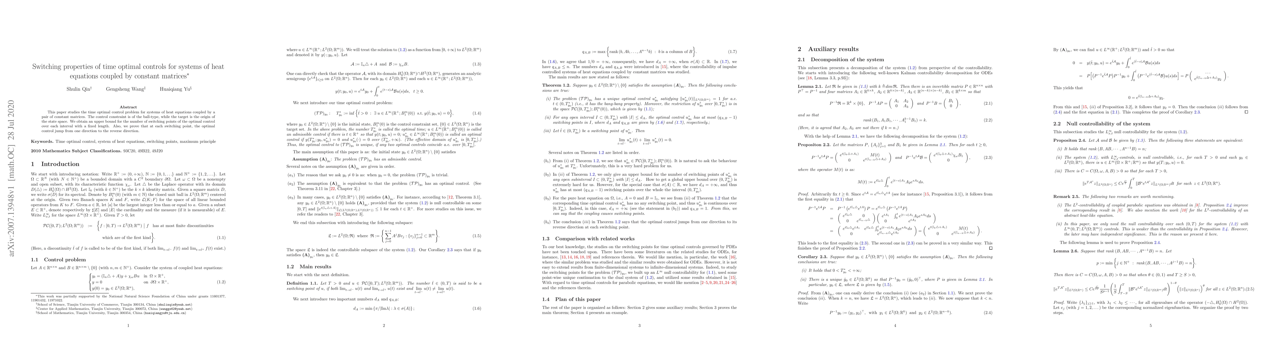 This paper investigates time optimal control for coupled heat equations, establishing an upper bound on switching points of the optimal control and proving that control reverses direction at each switching point.