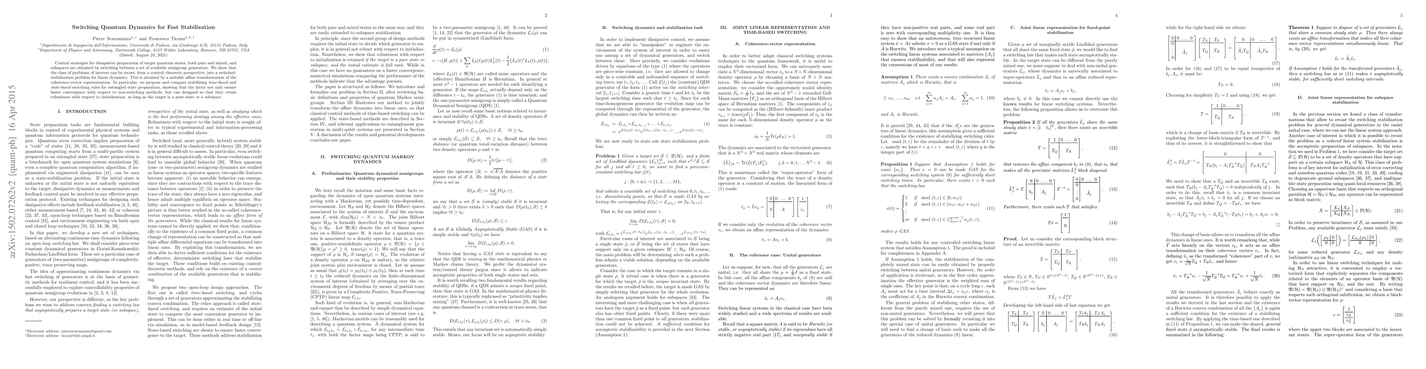 Control strategies for dissipative preparation of target quantum states, both pure and mixed, and subspaces are obtained by switching between a set of available semigroup generators. We show that the class of problems of interest can be recast, from a control--theoretic perspective, into a switched-stabilization problem for linear dynamics. This is attained by a suitable affine transformation of the coherence-vector representation. In particular, we propose and compare stabilizing time-based and state-based switching rules for entangled state preparation, showing that the latter not only ensure faster convergence with respect to non-switching methods, but can designed so that they retain robustness with respect to initialization, as long as the target is a pure state or a subspace.