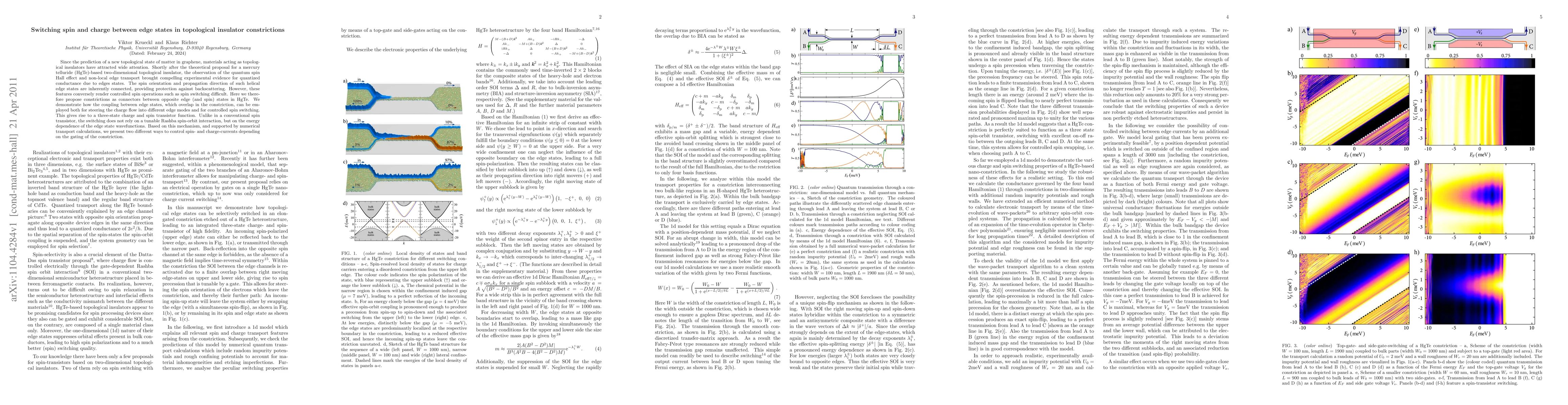 This paper proposes using constrictions in HgTe-based topological insulators to control spin and charge switching between helical edge states, demonstrating a three-state charge and spin transistor function without relying on Rashba spin-orbit interaction, but through the energy dependence of edge state wavefunctions. Numerical transport calculations support two methods of controlling spin- and charge-currents via constriction gating.