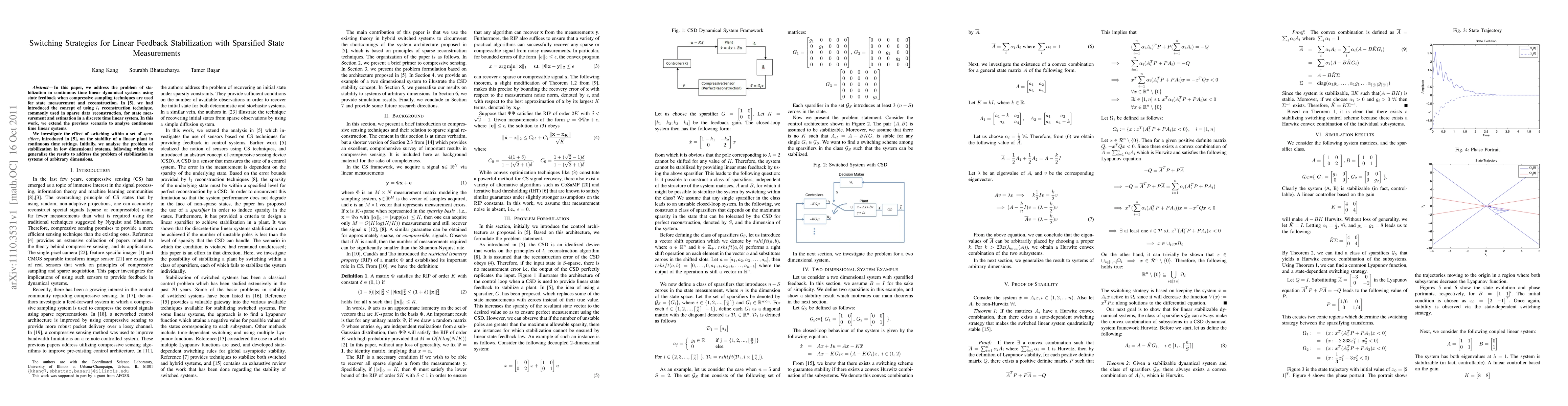 In this paper, we address the problem of stabilization in continuous time linear dynamical systems using state feedback when compressive sampling techniques are used for state measurement and reconstruction. In [5], we had introduced the concept of using l1 reconstruction technique, commonly used in sparse data reconstruction, for state measurement and estimation in a discrete time linear system. In this work, we extend the previous scenario to analyse continuous time linear systems. We investigate the effect of switching within a set of sparsifiers, introduced in [5], on the stability of a linear plant in continuous time settings. Initially, we analyze the problem of stabilization in low dimensional systems, following which we generalize the results to address the problem of stabilization in systems of arbitrary dimensions.